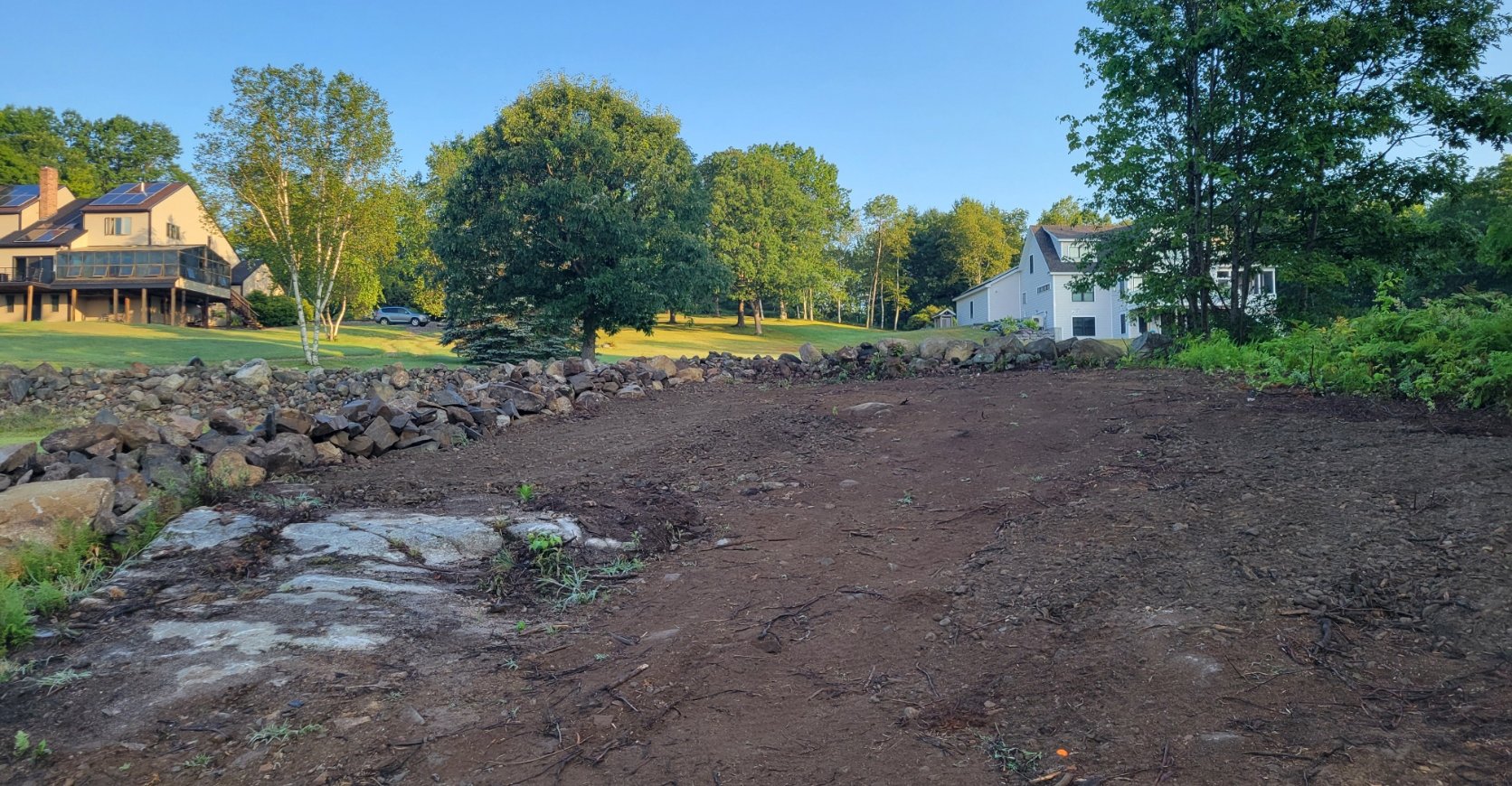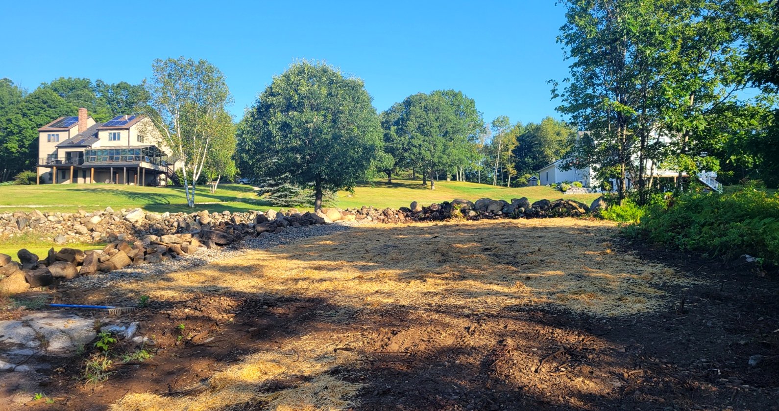 For today's Blog, here are two baseline images of the upper and lower cleared sections as taken from a middle point behind the newly constructed stone wall. There is much time involved towards turning these areas into picturesque outcomes. Also a key consideration is the ongoing maintenance challenge from weed growth and erosion during heavy rain storms. Beauty, stability, and weed control are all equally important when designing a solution.