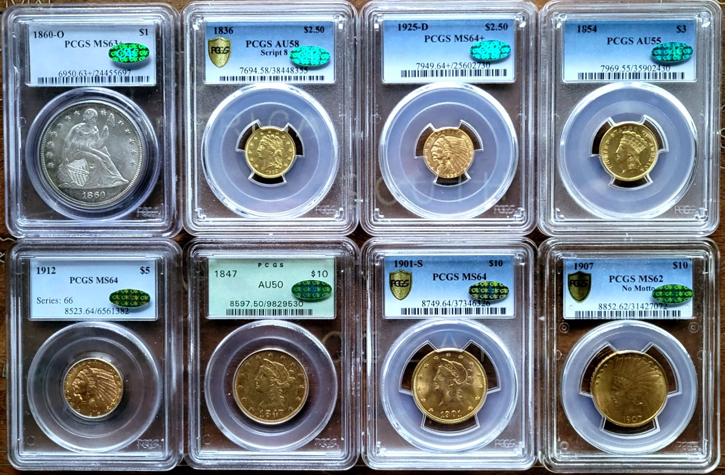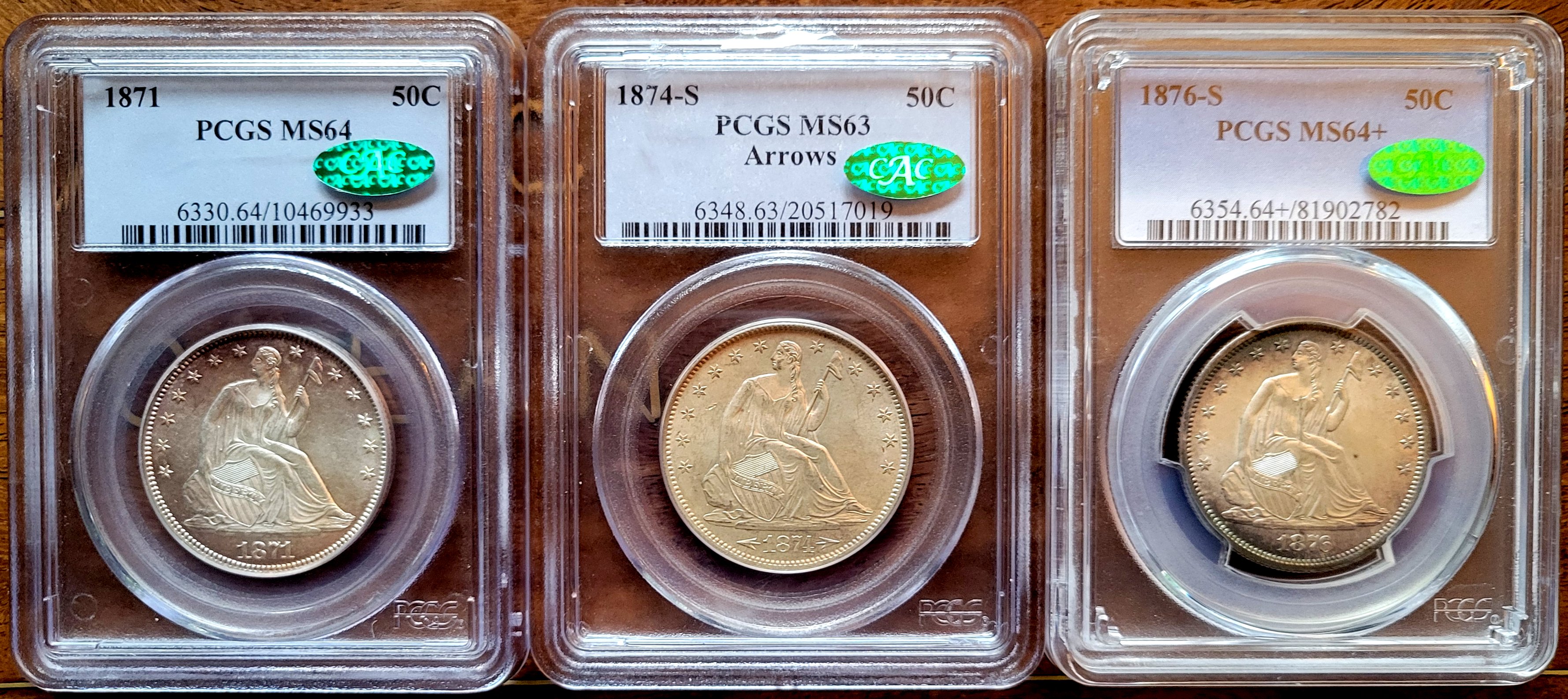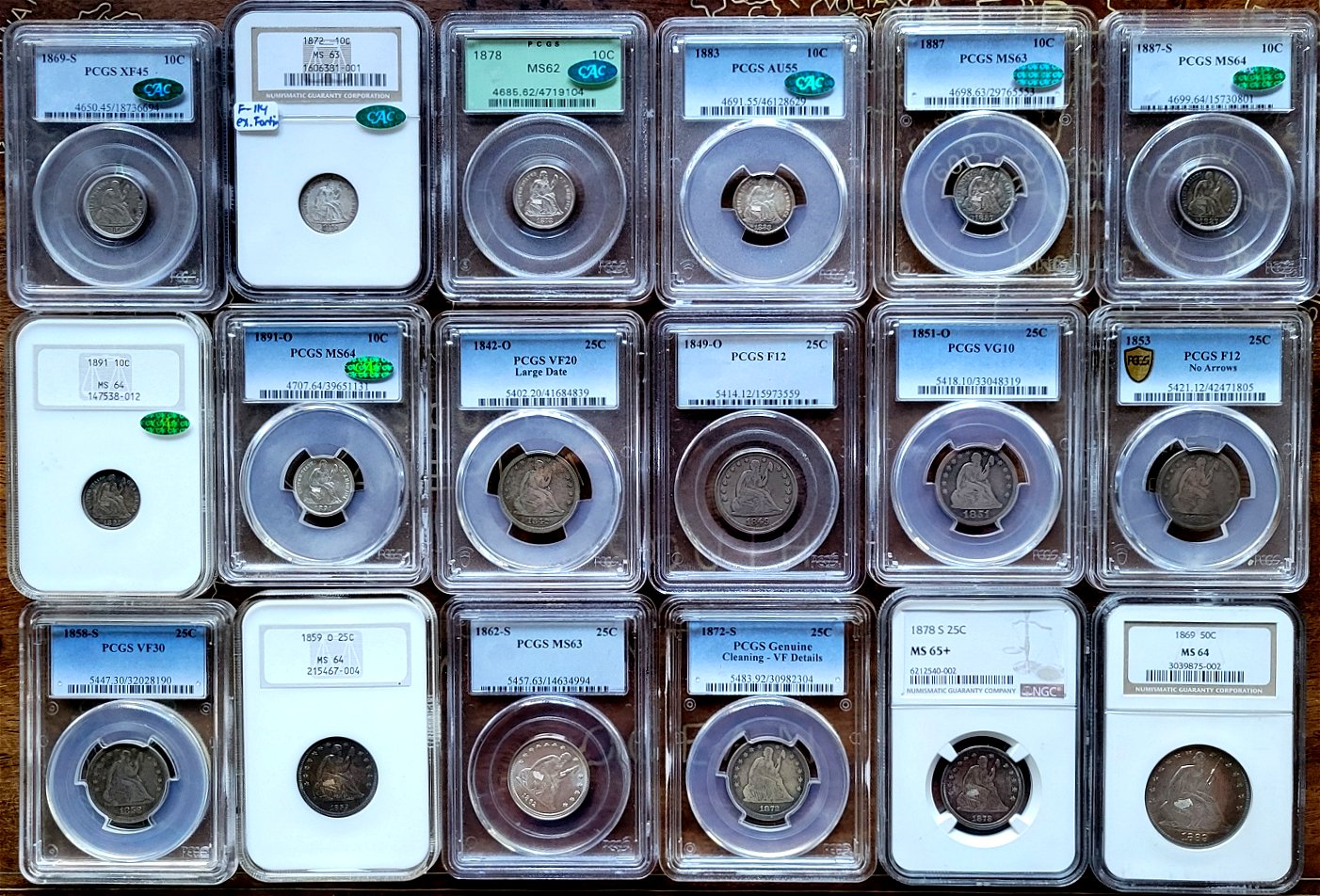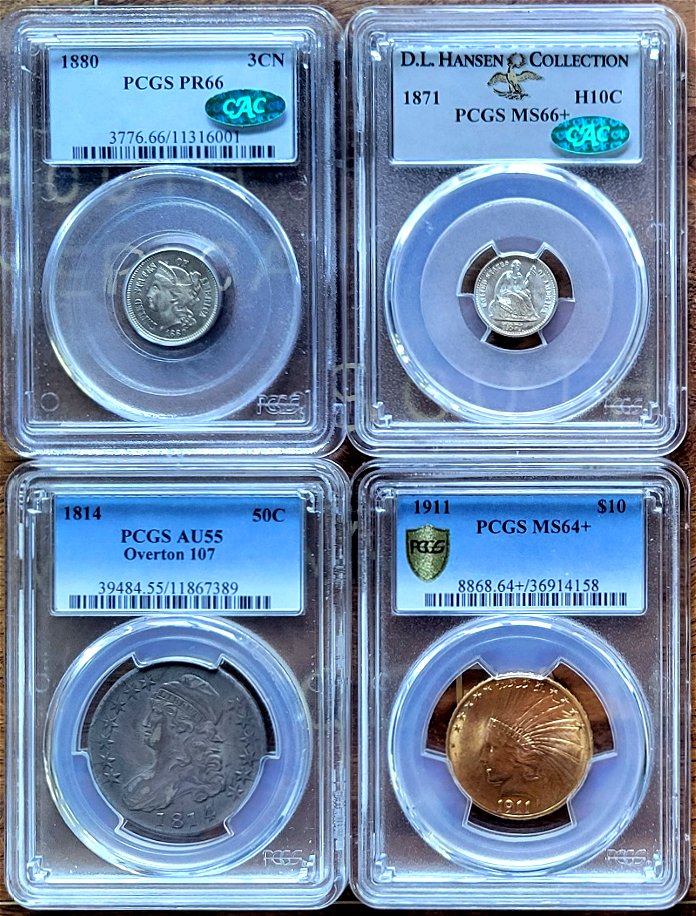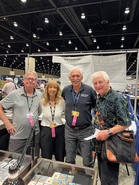 Before the clan's arrival, the afternoon was spent loading another tranche of Liberty Seated Dimes from the Massachusetts Collection. At this point, the big four Carson City dates are posted and featured next. Every complete Liberty Seated dime collection is judged by the quality of these four dates. In his set, Tom Coulombe choose quality surfaces over label grades for the his additions. Note the strict originality of these circulated pieces that resulted in CAC green beans being awarded for the 1871-CC through 1873-CC issues. As for the 1874-CC date, I know first hand the struggles to locate a suitable piece to finally complete his lifelong hobby project. The availability of CAC approved 1874-CC dimes is very limited and further complicated by a targeted price range. Tom ultimately decided to purchase the Steve Vitale Collection specimen from a March 2023 GFRC Online Auctions event. At that moment, decades of effort to assemble a premier Seated dime collection had been concluded much to his excitement.