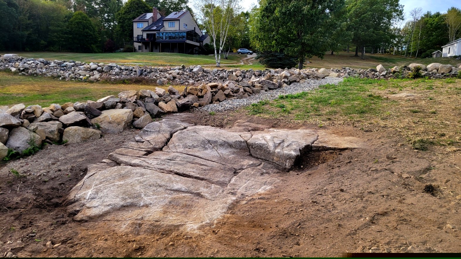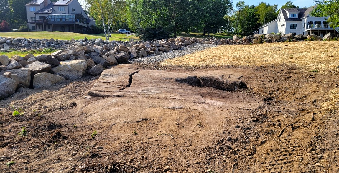 What is the strategy moving forward? The soil at the right side of the ledge will continue to be removed creating a sloped bank. That sloping area will be covered with weed mat and 1.5" crushed stone so that the water will be guided across the right side of the ledge. Stone will also be added at the top of the outcrop to hold the upper soil in place. More images will be shared as a final landscape solution is implemented.