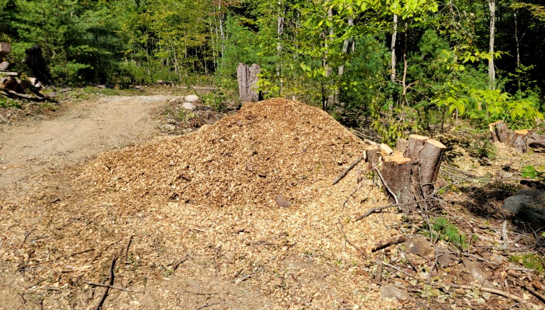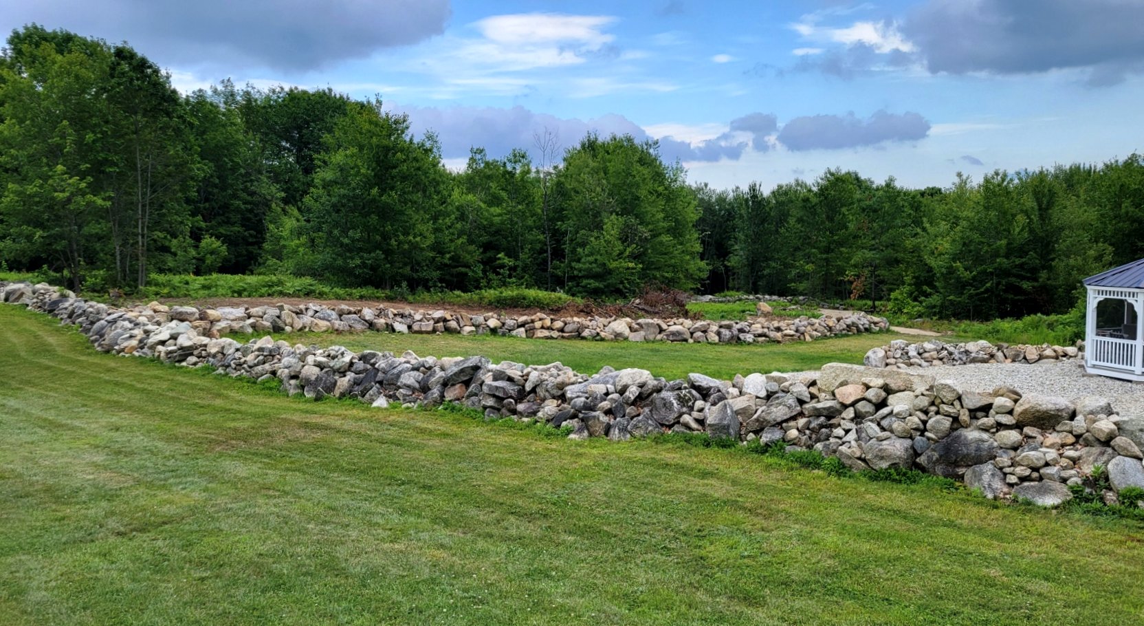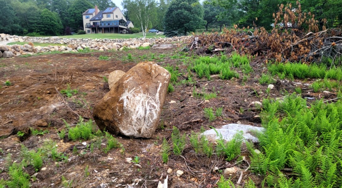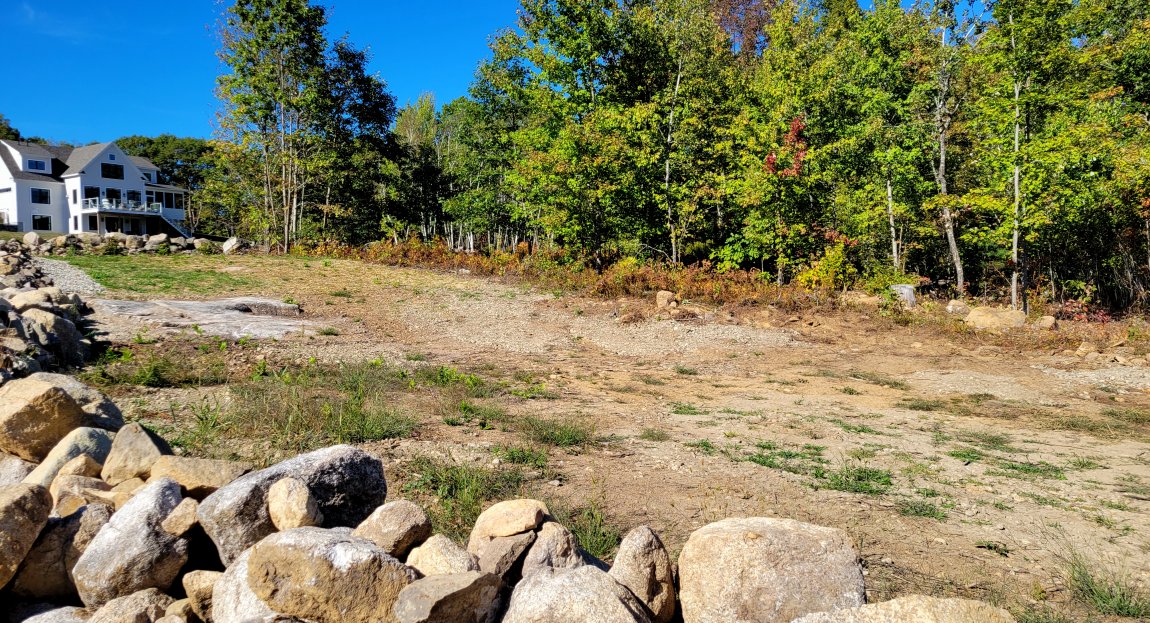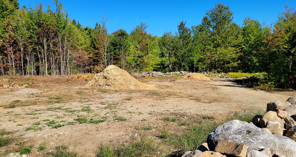 For the next week, the back acreage focus will be on the recently cleared area behind the summer of 2025 constructed stone wall. To date, this downward sloping land has been mostly cleared of brush and larger rocks. A portion of the upper section has been seeded, but with drought conditions, little grass has appeared. The primary landscaping options are seeding grass, utilizing 1.5" crushed stone, or laying down wood chips. After studying the situation yesterday afternoon, the landscaping solution will be a combination of all three approaches.