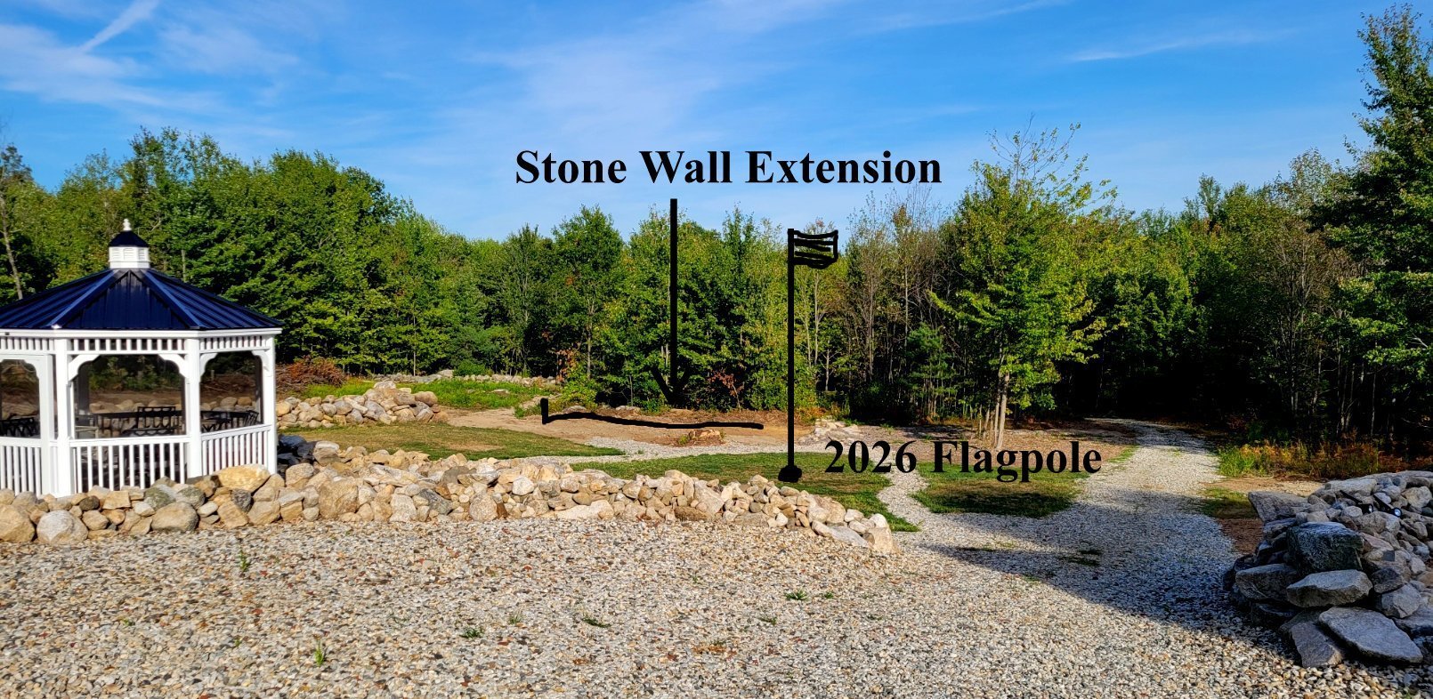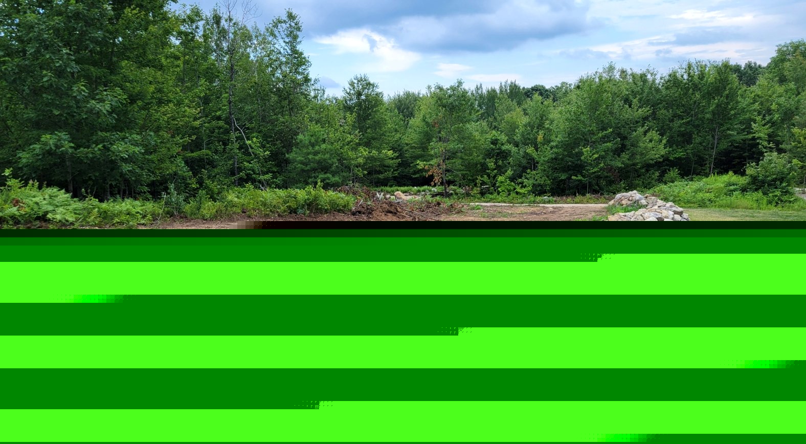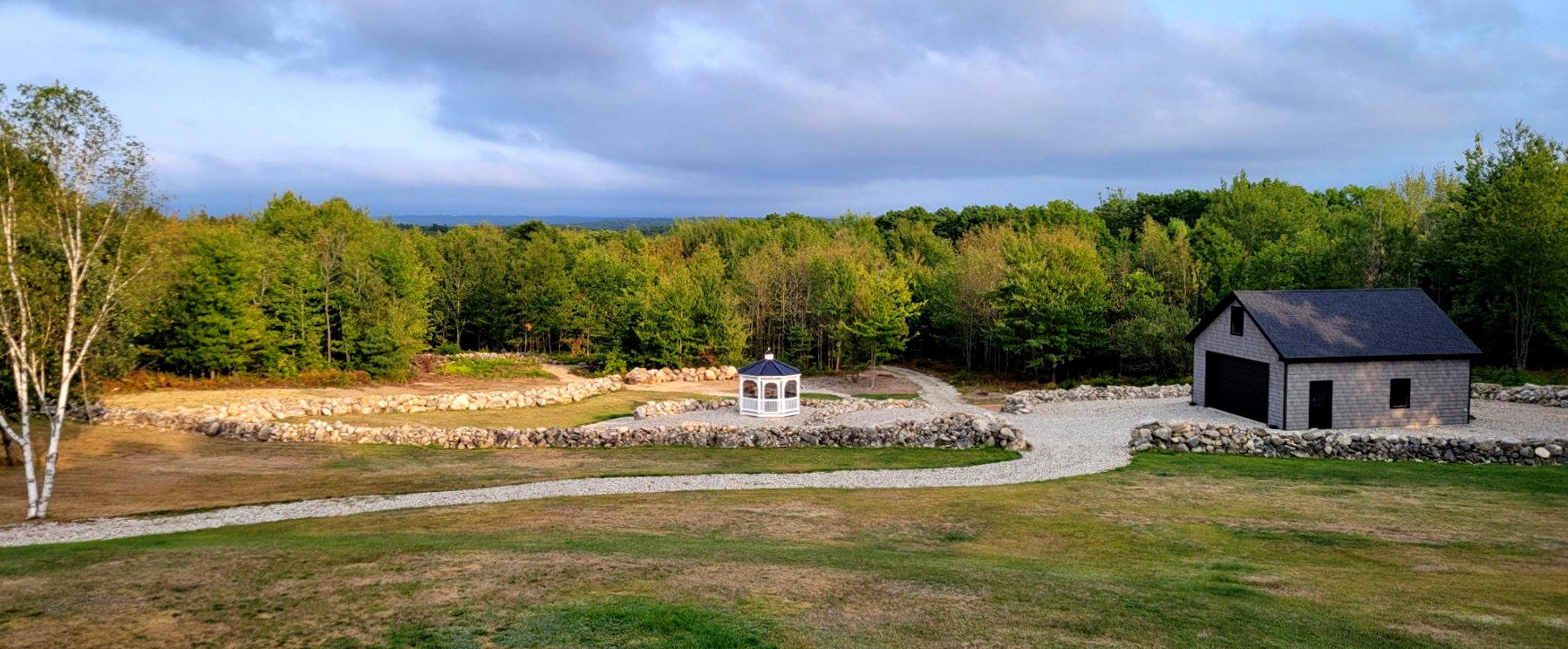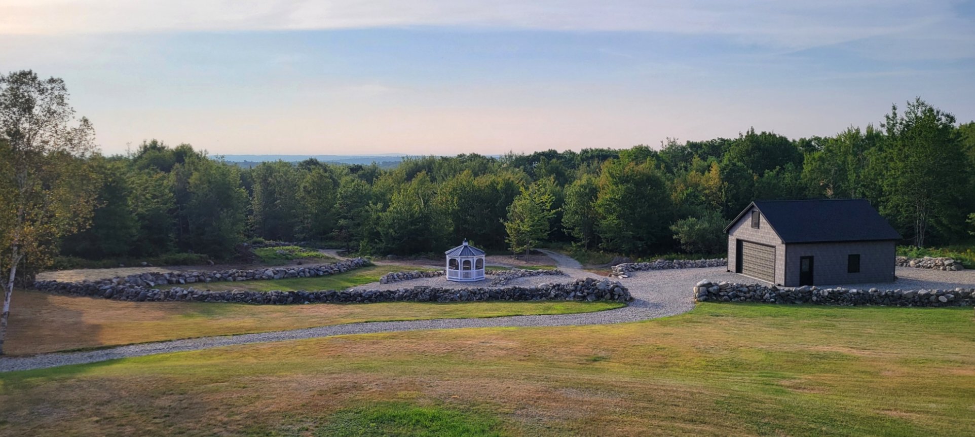 For the next week, the back acreage focus will be on the recently cleared area behind the summer of 2025 constructed stone wall. To date, this downward sloping land has been mostly cleared of brush and larger rocks. A portion of the upper section has been seeded, but with drought conditions, little grass has appeared. The primary landscaping options are seeding grass, utilizing 1.5" crushed stone, or laying down wood chips. After studying the situation yesterday afternoon, the landscaping solution will be a combination of all three approaches.
