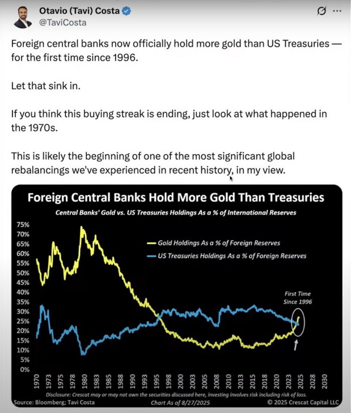 - Gold now exceeds U.S. Treasuries in terms of foreign reserve holdings.