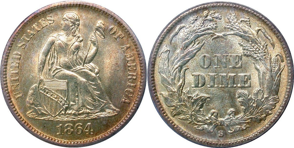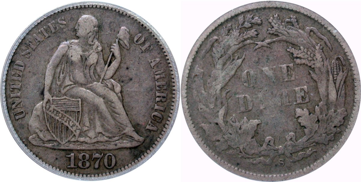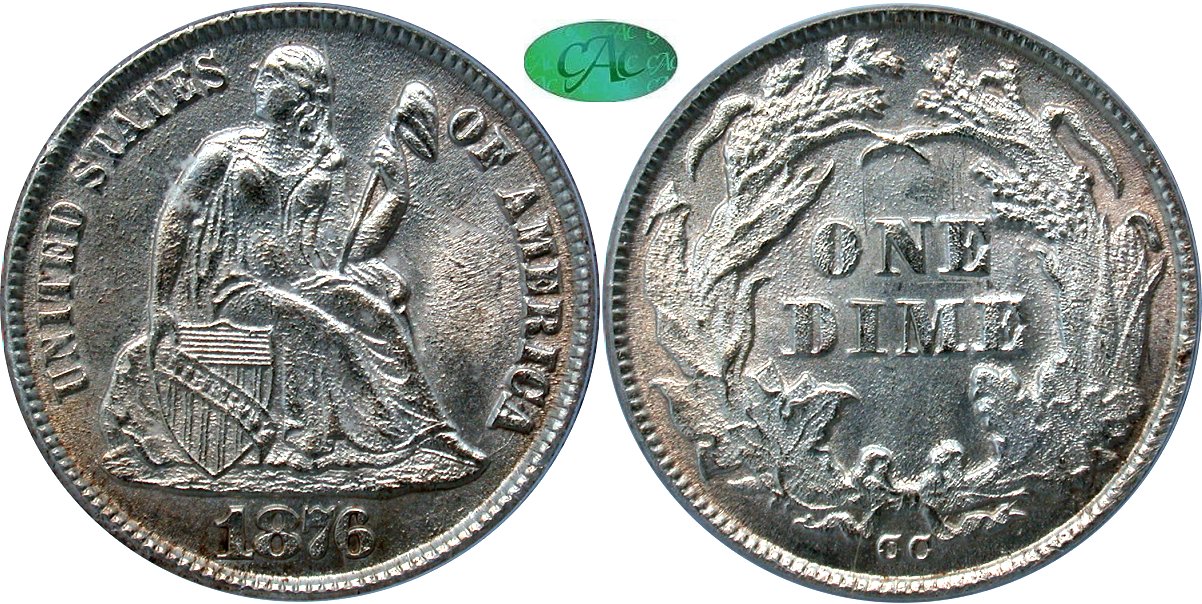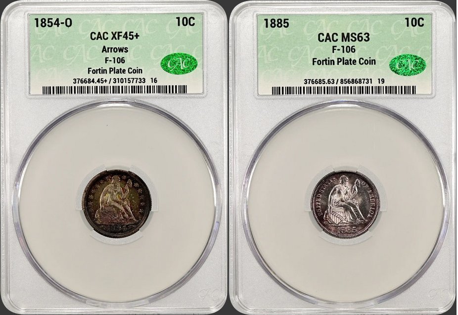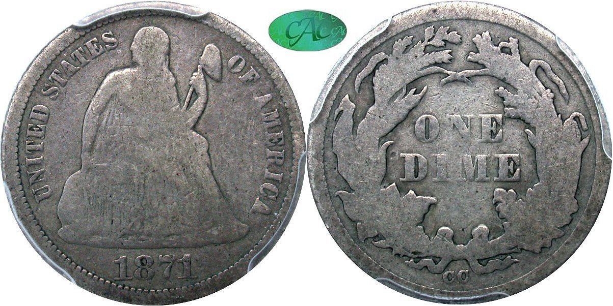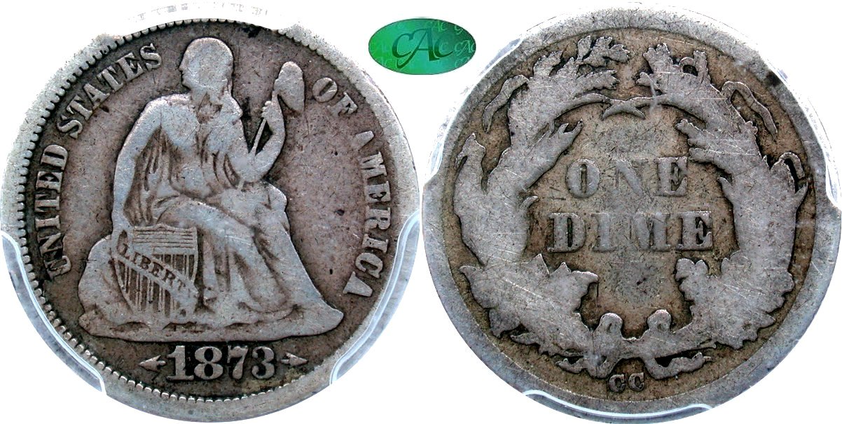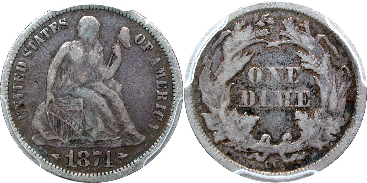 1873-CC Arrows PCGS F12 CAC 10C - $8500                                           1874-CC PCGS VF25 10C - $23500
