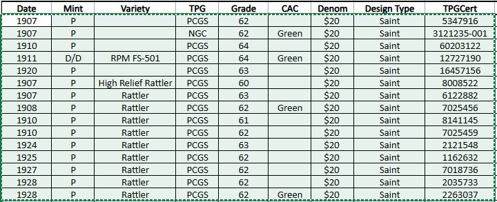 I'm pleased to announce that another $20 St Gaudens shipment will arrive to the office this week. The contents are more bullion centric with PCGS MS62 grades being prevalent. These will be offered first to those clients who have been active buyers in the recent two offerings.