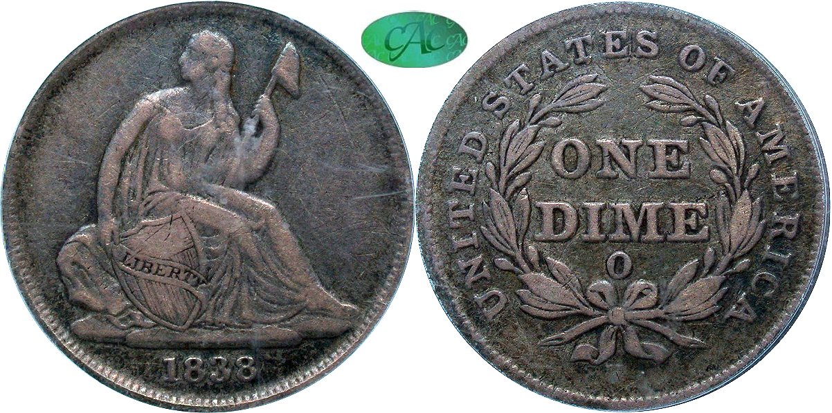 Choice $820 New November 26! Choice Original, Thick Rose-Gray Patina, Tenafly Collection. 2025 Black Friday Sale Offering - A choice original 1838 New Orleans strike with old time rose-gray patina that is expected for the date. The F-102 die pairing features an eroded obverse die since a single die was employed to strike the entire 1838-O mintage. During the F-102 die pairing, the obverse is eroded with a loss of major device details as seen on this example. Blemishes are limited to several ancient field lines that did not bother CAC. The 1838-O date is often selected for a type set given the higher degree of difficulty. CAC has approved 70 in all grades with a price guide value of $900 as reference. Previously from the Woodlands Collection via GFRC. Housed in PCGS Gen 4.4 (2005-2011) holder with CAC approval. PCGS #4564.