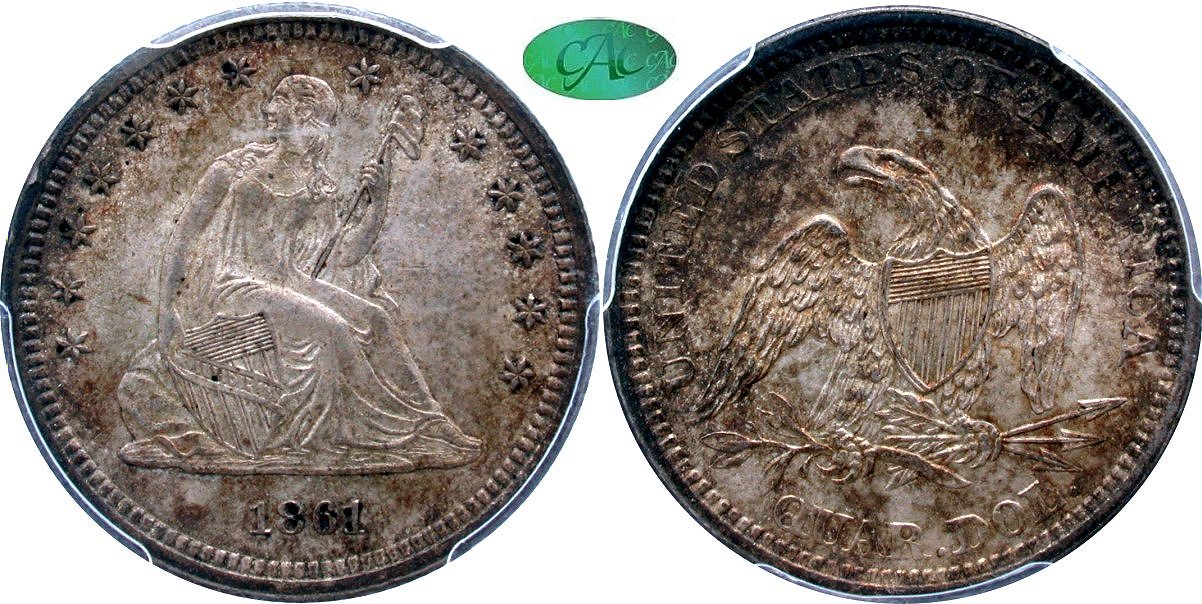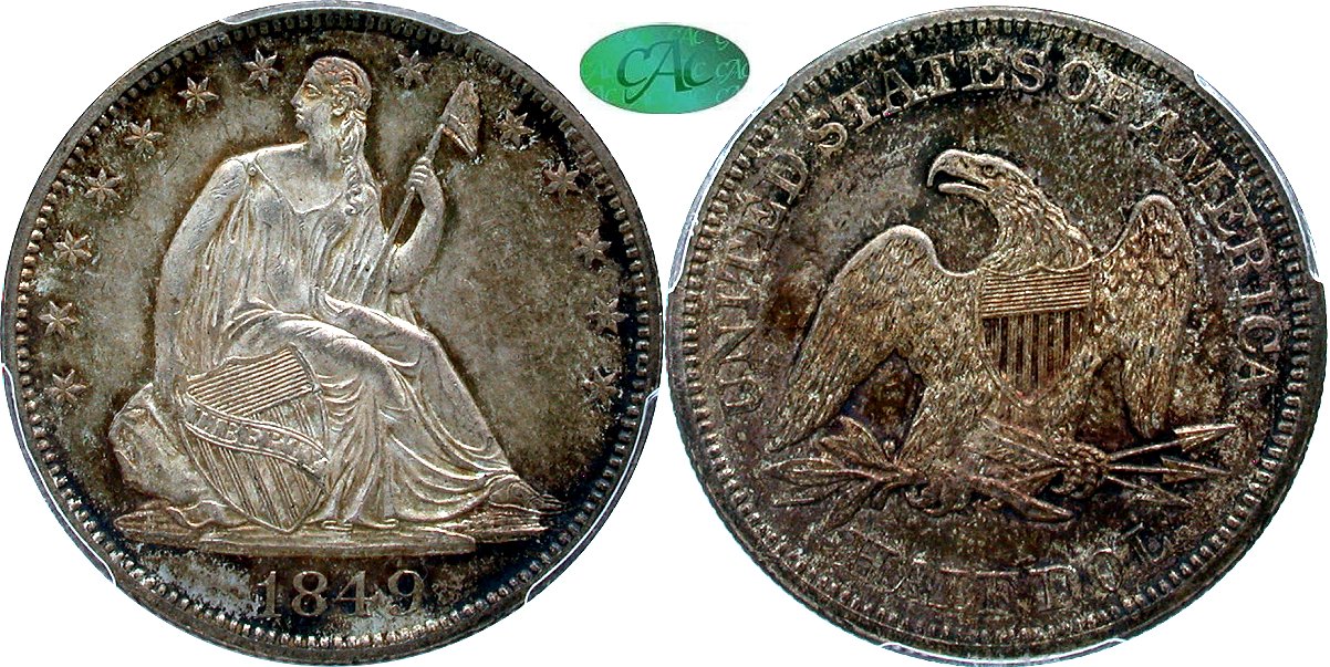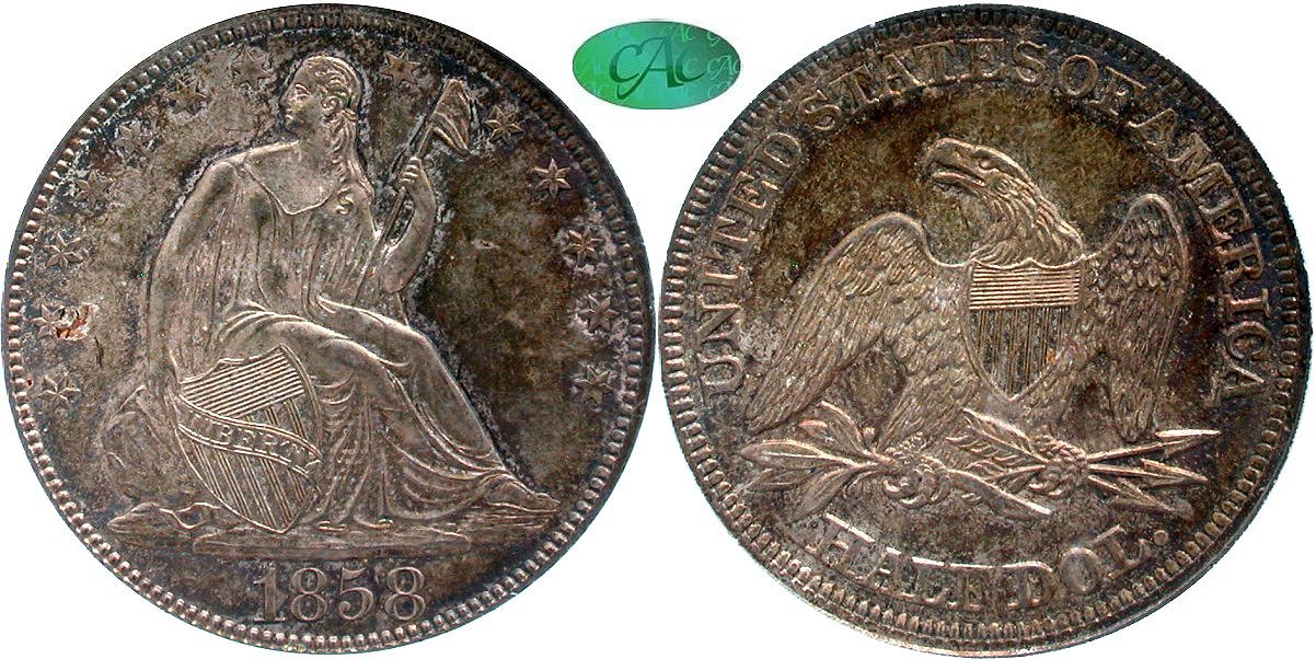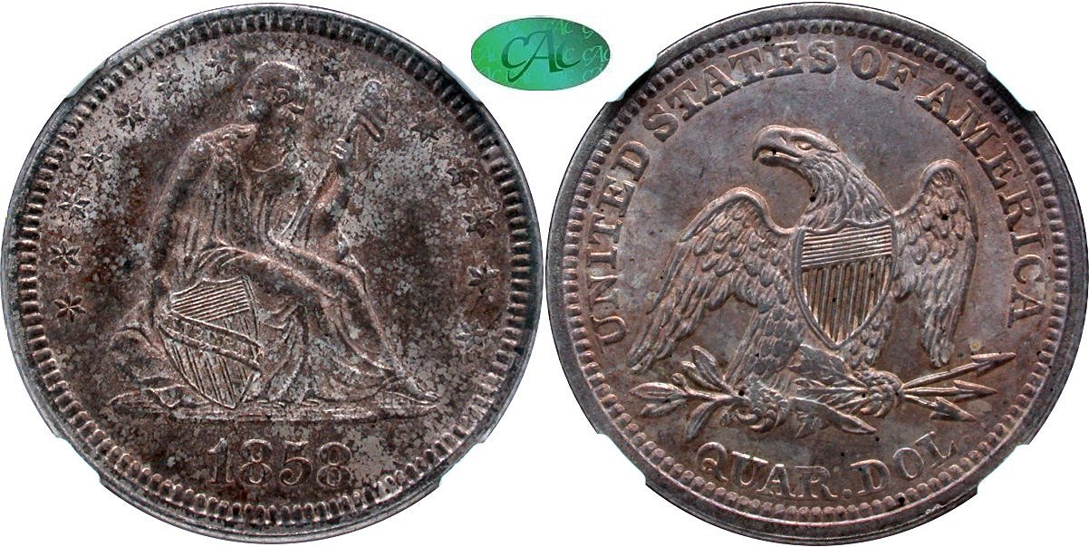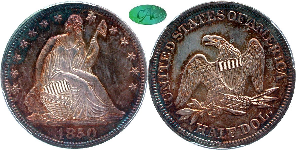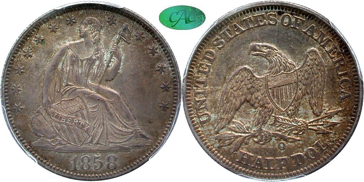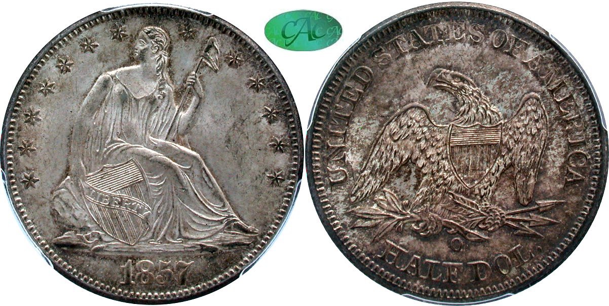 Choice $625 Frosted Luster, Complete Strike, Well Preserved, Sheffield Collection. With a smidgen over 1,000,000 struck, the 1860 New Orleans issue falls into the "common" realm though premium Mint State survivors are limited. The Sheffield Collection is releasing a conservatively graded example with frosted luster and a fully detailed strike. Intermixed grays and brown shades are overlaid on a silver background on the obverse while the reverse presents light gold with aquamarine towards the borders. The CACG census tally is seven graded with a price guide value of $625 at grade. The offer price is quite reasonable for a quick sale. Housed in new CACG holder and graded to strict standards employed for CAC stickering approval.