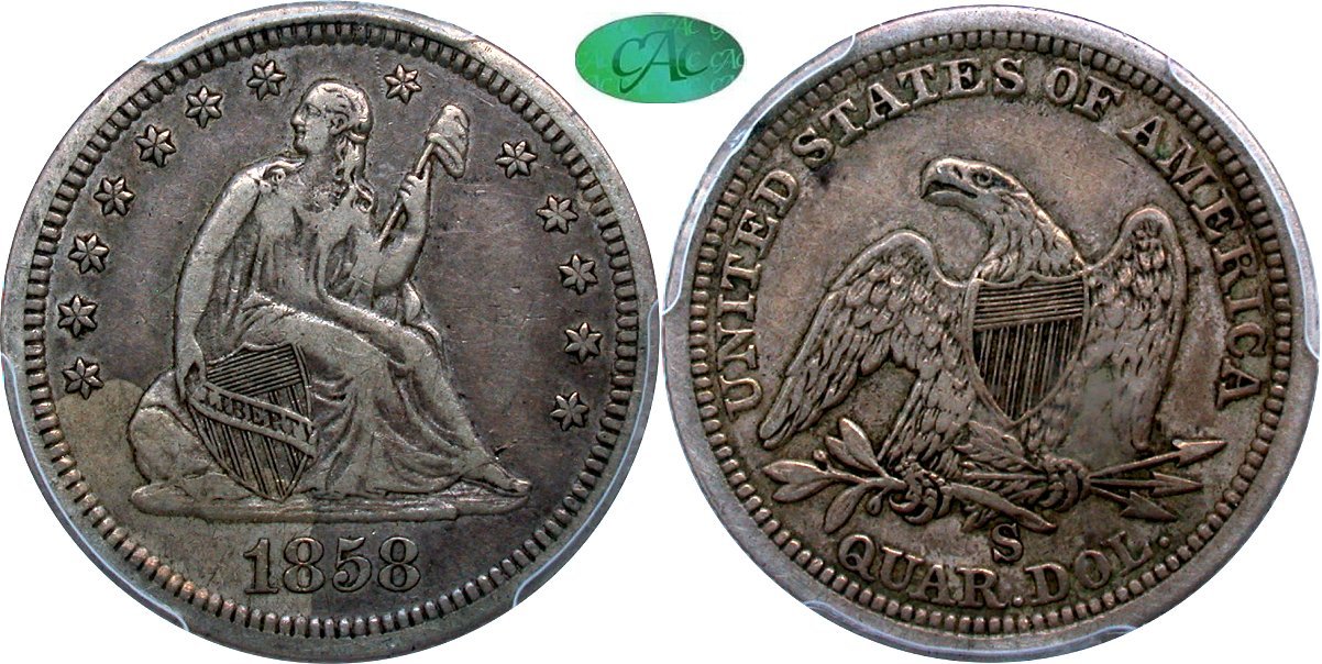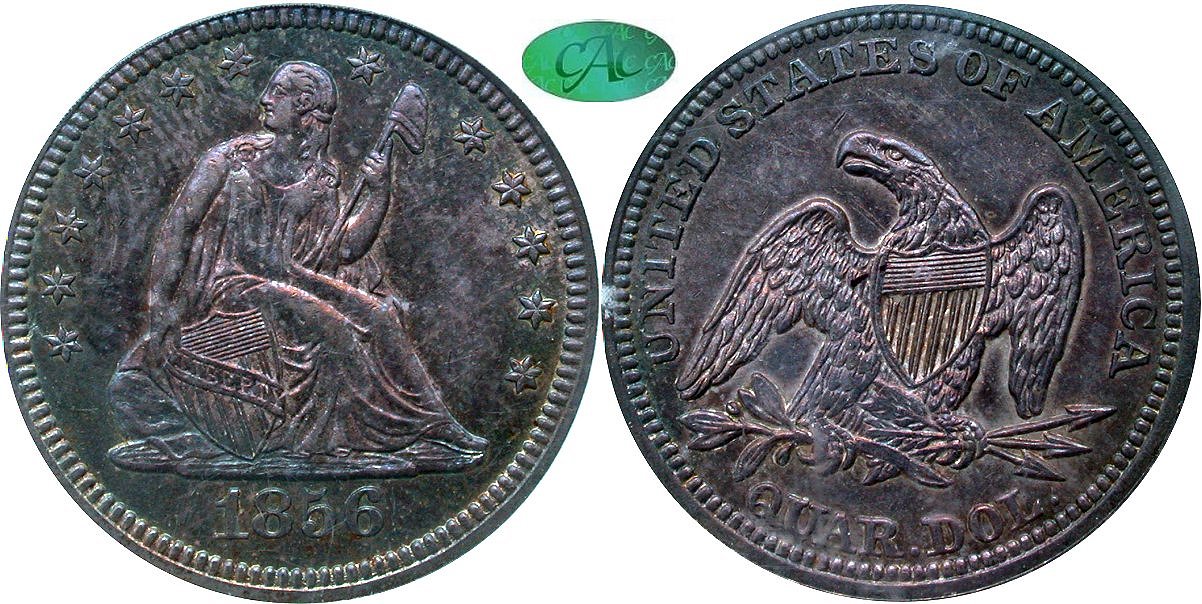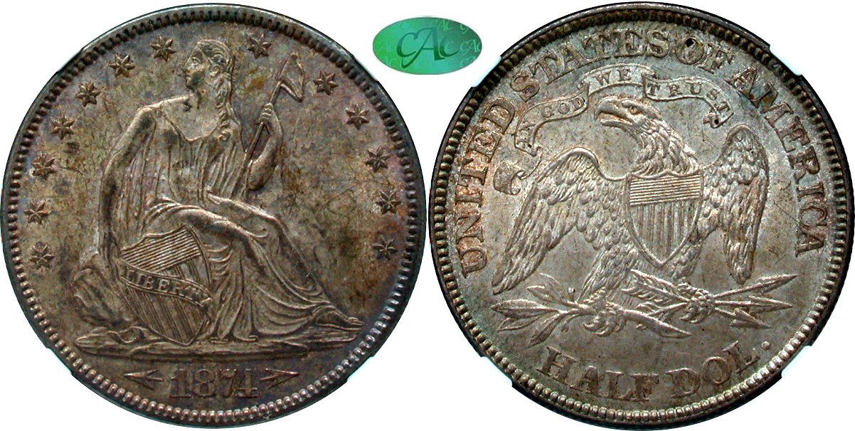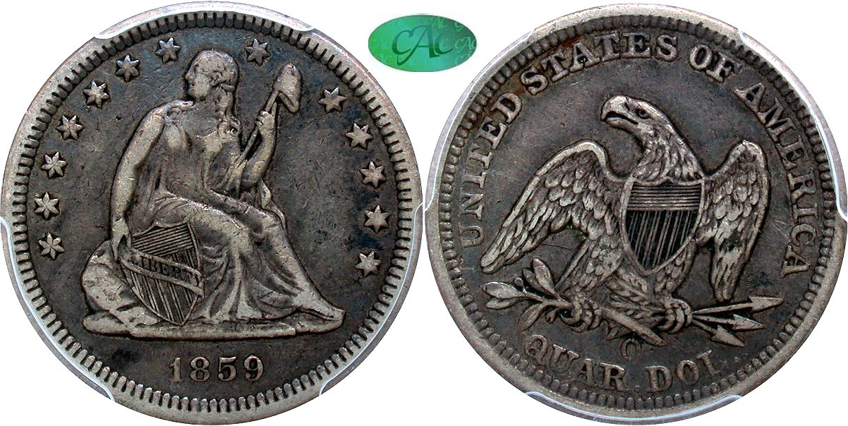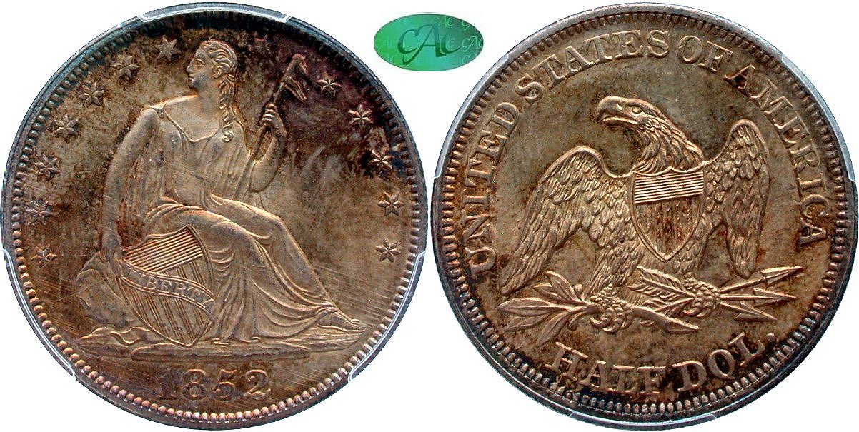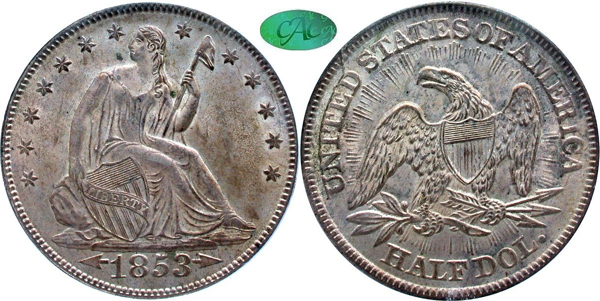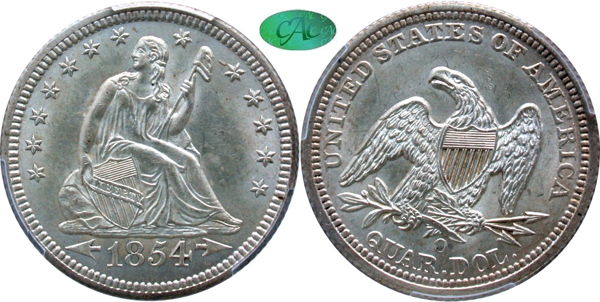 Choice $625 Frosted Luster, Complete Strike, Well Preserved, Sheffield Collection. With a smidgen over 1,000,000 struck, the 1860 New Orleans issue falls into the "common" realm though premium Mint State survivors are limited. The Sheffield Collection is releasing a conservatively graded example with frosted luster and a fully detailed strike. Intermixed grays and brown shades are overlaid on a silver background on the obverse while the reverse presents light gold with aquamarine towards the borders. The CACG census tally is seven graded with a price guide value of $625 at grade. The offer price is quite reasonable for a quick sale. Housed in new CACG holder and graded to strict standards employed for CAC stickering approval.