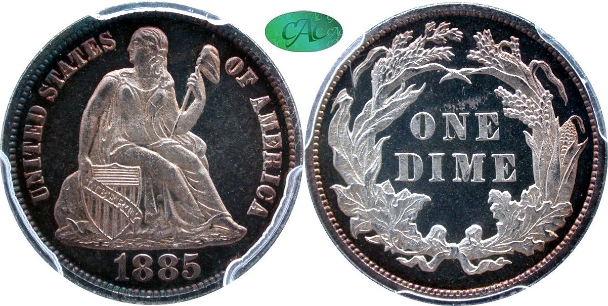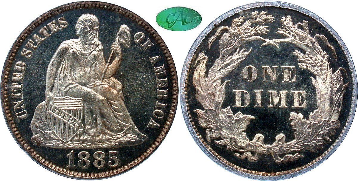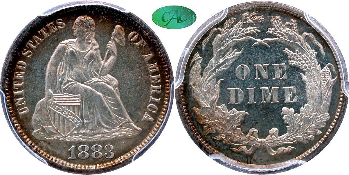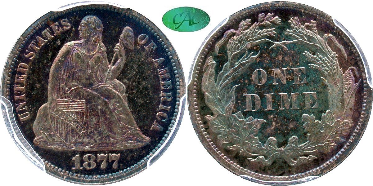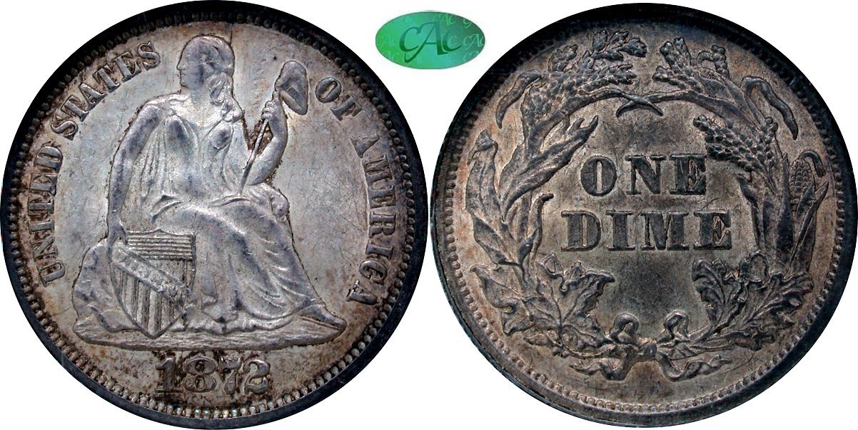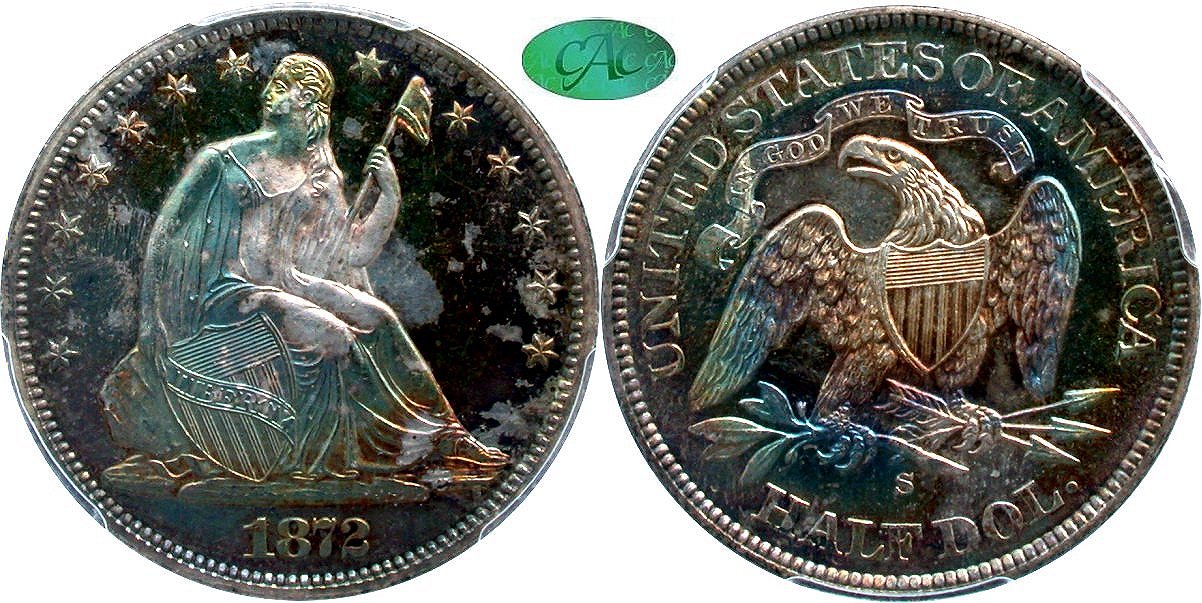 Gem $950 Watery Mirrored, Colorful Presentation, Pristine Surfaces, Fresh CACG Grading. 1872 Liberty Seated half dimes proof strikes totaled 950 pieces. This survivor has been meticulous preserved leading to a host of positive attributes. First are the watery mirrors noted under a bright light along with colorful toning that consists of blues, aquamarine, and gold on the obverse while the reverse presents a rose center surrounded by green-gold overlaying the wreath. Second are the pristine surfaces without any traces of a single hairline. Finally, the strike is fully executed along with partial wire rims. The watery mirrors will be thoroughly enjoyed under a bright light. The lovely little half dime has been conservatively graded and is housed in new CAC Grading holder and graded consistent with CAC approval standards.