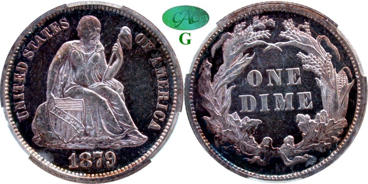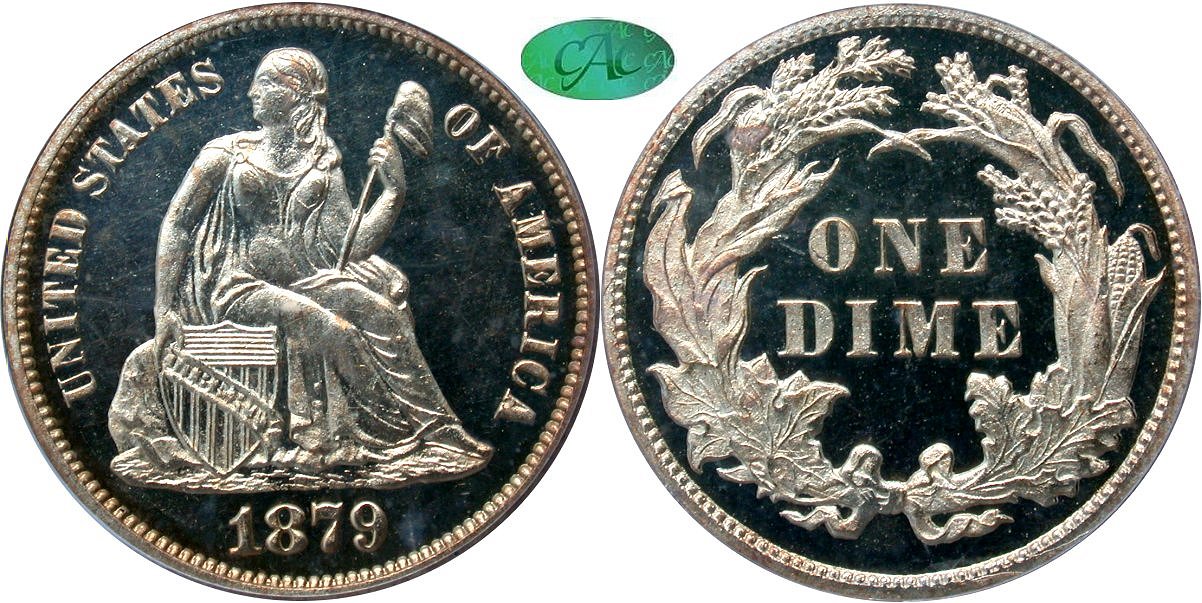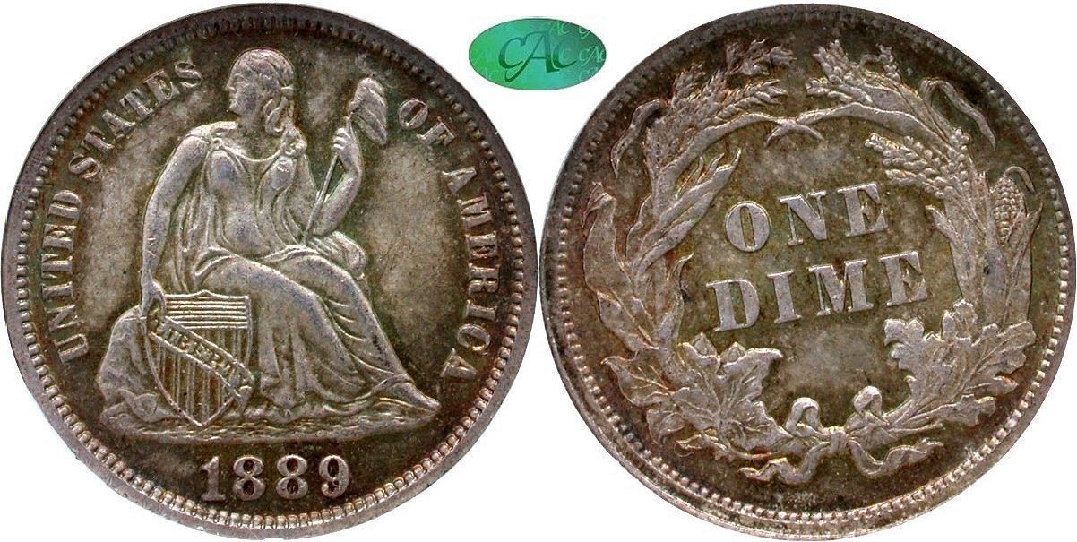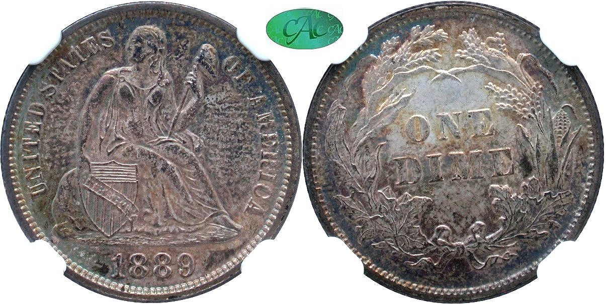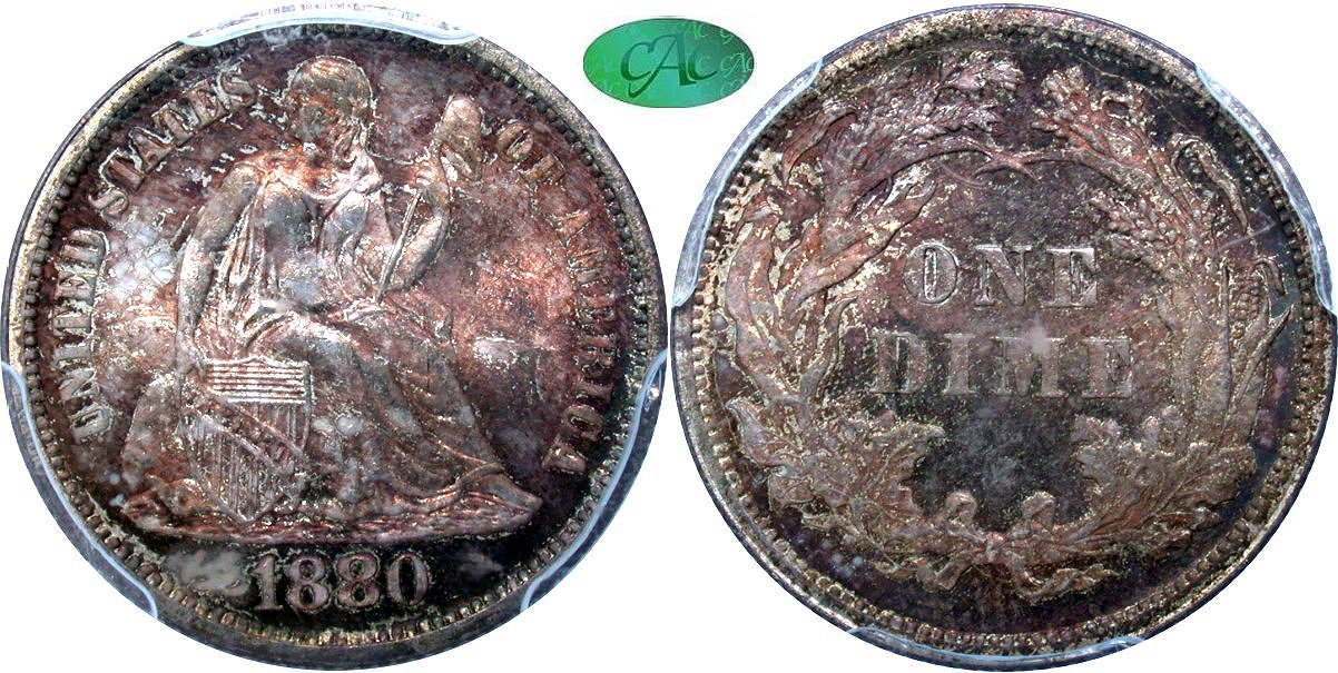 Gem $950 Watery Mirrored, Colorful Presentation, Pristine Surfaces, Fresh CACG Grading. 1872 Liberty Seated half dimes proof strikes totaled 950 pieces. This survivor has been meticulous preserved leading to a host of positive attributes. First are the watery mirrors noted under a bright light along with colorful toning that consists of blues, aquamarine, and gold on the obverse while the reverse presents a rose center surrounded by green-gold overlaying the wreath. Second are the pristine surfaces without any traces of a single hairline. Finally, the strike is fully executed along with partial wire rims. The watery mirrors will be thoroughly enjoyed under a bright light. The lovely little half dime has been conservatively graded and is housed in new CAC Grading holder and graded consistent with CAC approval standards.