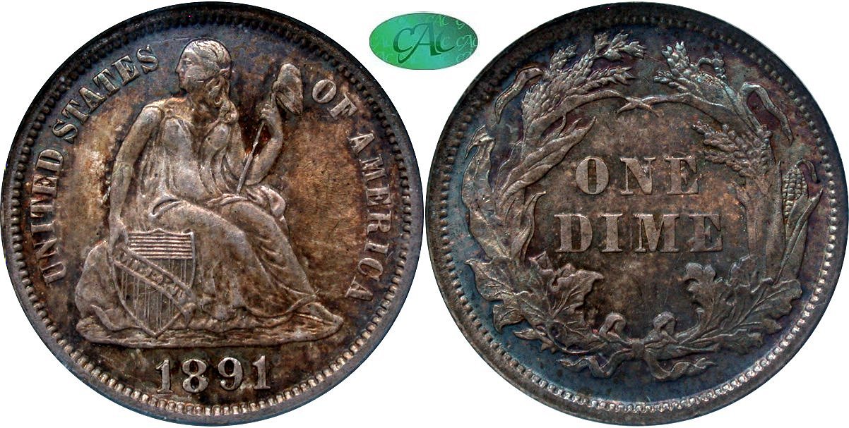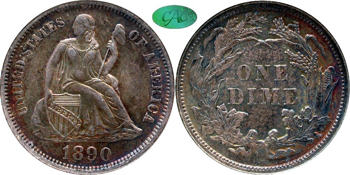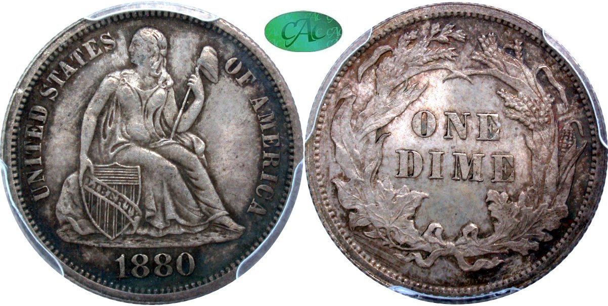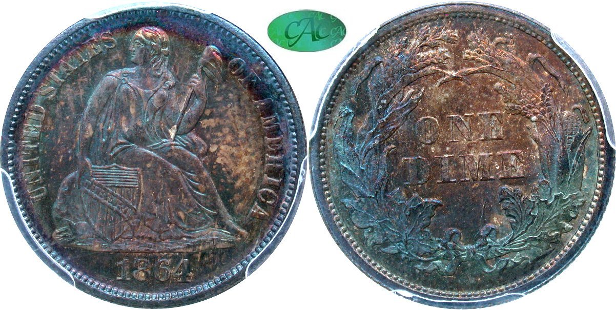 Choice $1230 New November 26! Little Orphan Annie Date, Choice Original, Tenafly Collection. 2025 Black Friday Sale Offering - CAC approved 1844 dimes aka. The Little Orphan Annie, infrequently appear on the GFRC price list with CAC approval. This Tenafly Collection example is a special piece with choice surfaces covered by a multi-colored skin that includes rose, orange, gold, green and gray shades. The older holder is well worn with plastic scratches across the front side. Images capture a portion of the holder lines. The CAC price guide indicates $1150 as fair market value, but researching the Sales Archive may reveal this number to be too conservative based on prior GFRC sales. Housed in Gen 4.5 (2011-2013) holder with CAC Approval. PCGS #4585.