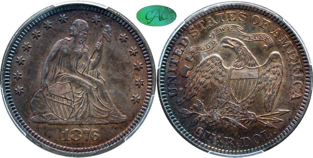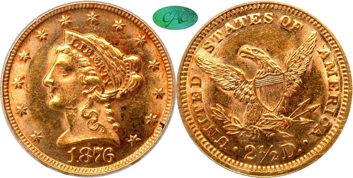 Choice $5060 Notably Rare Date in Mint State, Partially Mirrored, CAC Approved, Oregon Beaver Collection. Consignor Price Reduction - The 1876 gold quarter eagle date sports a mintage of only 4,170 and is a rarity in Mint State. In terms of CAC approval, this date is a major rarity with this example only at the MS61 grade level with six finer. Bright honey-gold surfaces are partially mirrored reflective, with minimal abrasions for the grade. Under a bright light, cartwheels are readily apparent with no obtrusive anomalies. Strike softness on Liberty47s hair curls and the eagle47s left leg is typical of the issue. A fresh release from the Oregon Beaver Collection that is worth of consideration. Housed in a PCGS Gen 4.4 (2005-2011) holder with CAC approval.