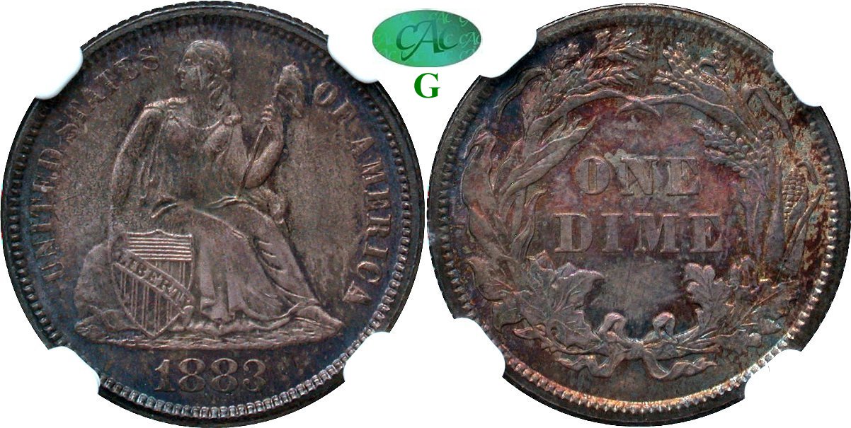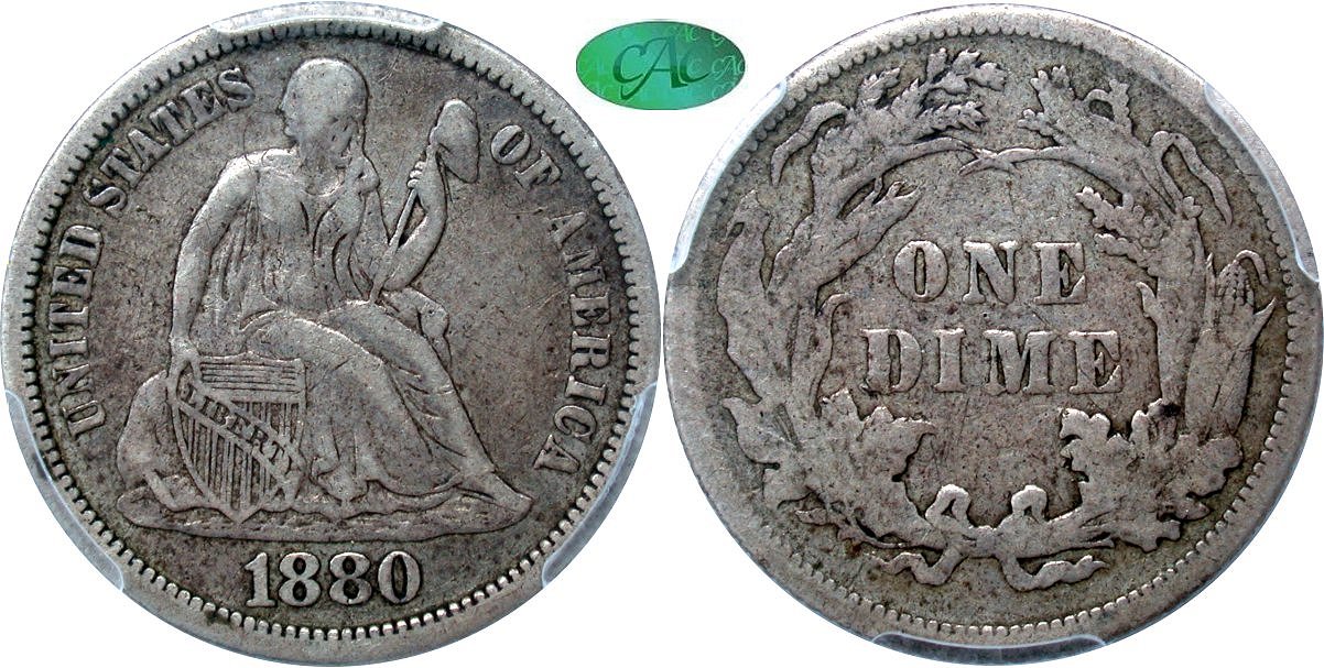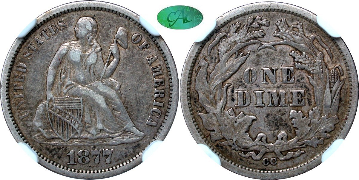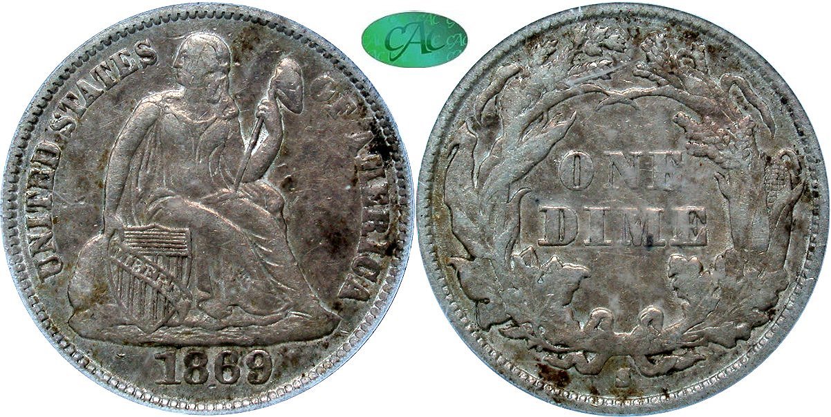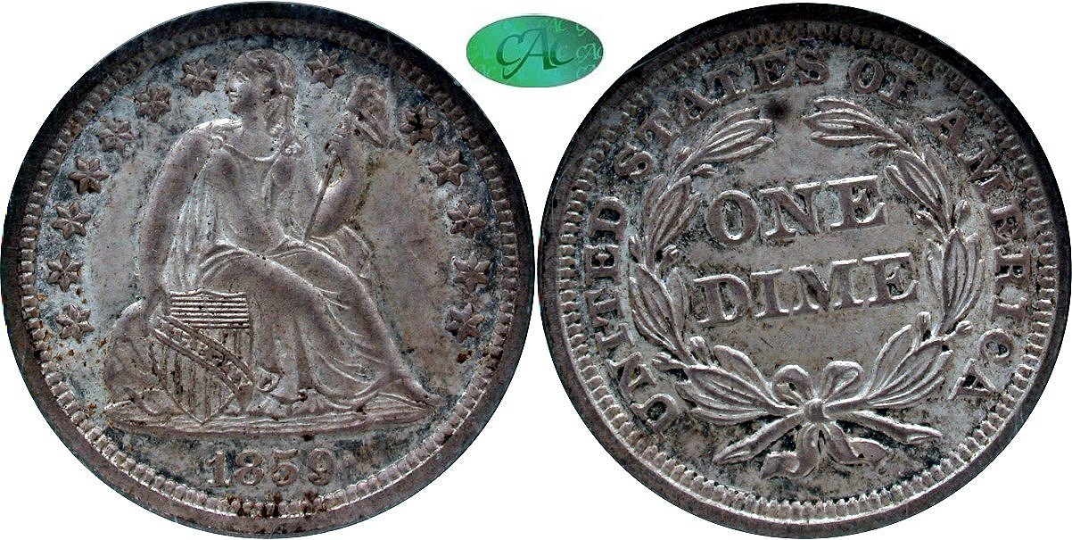 Gem $2575 New November 25! Extra 9 in Gown, Gem Original, Cleveland Collection.. 2025 Black Friday Sale Offering - The Cleveland Collection is releasing this 1859 F-103 gem Seated Dime that originated from the Fortin core set collection during November 2022. It is an excellent example of a With Stars misplaced date. The bottom loop of the extra 9 digit in the gown was evident in Kam Ahwash47s Encyclopedia for 14 years until Fortin discovered its existence during 1991. This is a popular variety that is listed as #46 in the Top 100 Varieties set and also included in the Top 25 Misplaced Date set. Let47s get back to the offered example. Crusty coin-gray patina covers both side of this gem along with speckled ebony-gray at the stars and legend. Strike is complete with elevated motifs, especially the reverse wreath leaves. Surfaces are entirely unabraded. Purchased by Fortin during February 2007 from Jason Carter and employed as the F-103 plate coin with The Definitive Resource for Liberty Seated Dime Variety Collectors online reference. Housed in NGC Gen 17 (2004-2008) holder with CAC approval.