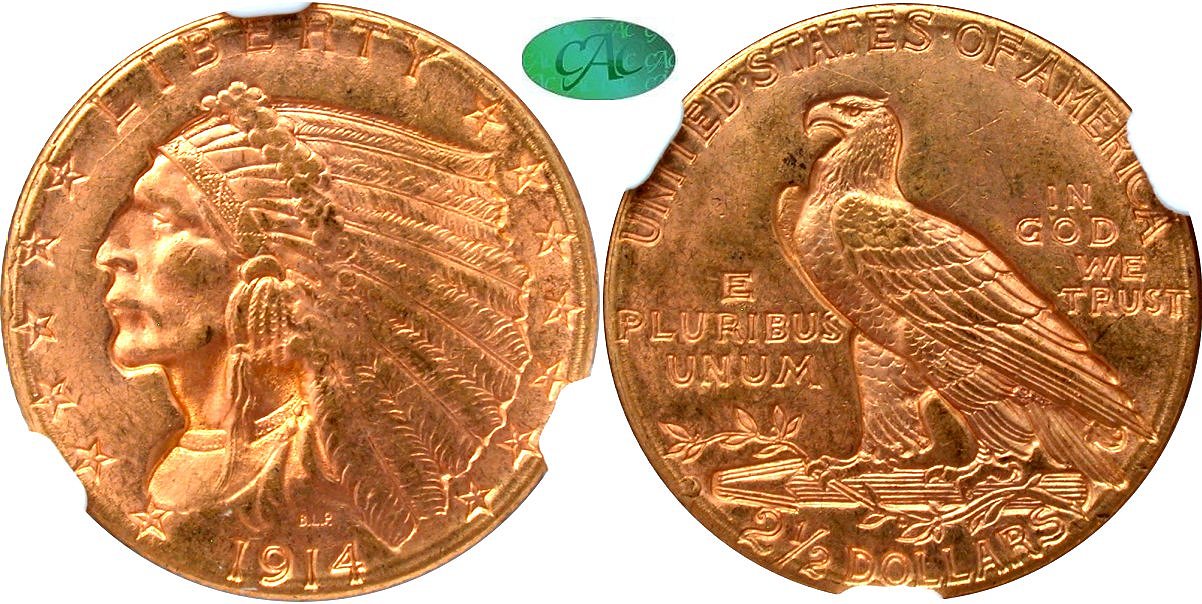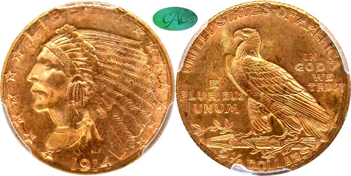 Choice $3850 New December 4! Underrated Date, Glowing Satiny Luster, Honey-Gold. A premium 1914-D $2.5 gold offering from a mintage of 448,000 piece that should fill that better date hole in a date and mintmark set. This date is the third rarest issue of the series with a notable population drop at the MS64 level. This choice example, with CAC approval, exhibits glowing satiny luster during bright light inspection. Vibrant cartwheels are pleasing at the certified grade as is the honey gold coloration. A well balanced piece that needs a home in a small denomination Indian gold set. Housed in PCGS Gen 6.0 (2015-2020) holder with CAC approval.