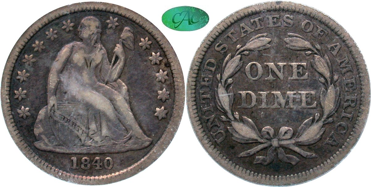 Choice $455 New November 26! With Drapery, Choice Original, Tenafly Collection. 2025 Black Friday Sale Offering - 1840 With Drapery dimes are always in demand due to much lower availability than earlier No Drapery counterparts. It appears that few collectors paid attention to the 1840 design hub transition. Instead, the mintage circulated heavily leaving just a handful of true Mint State examples for modern day collectors. This VF25 graded example is well preserved after spending a fair amount of time in circulation. Fields are toned a natural gray while wear points have much lighter coloring. The result is circulated cameo eye appeal for those who are so inclined. Surfaces are unabraded, another important factor contributing to overall eye appeal. The CAC price guide is $460 as reference. Housed in PCGS Gen 4.4 (2005-2011) holder with CAC approval. PCGS #4578.