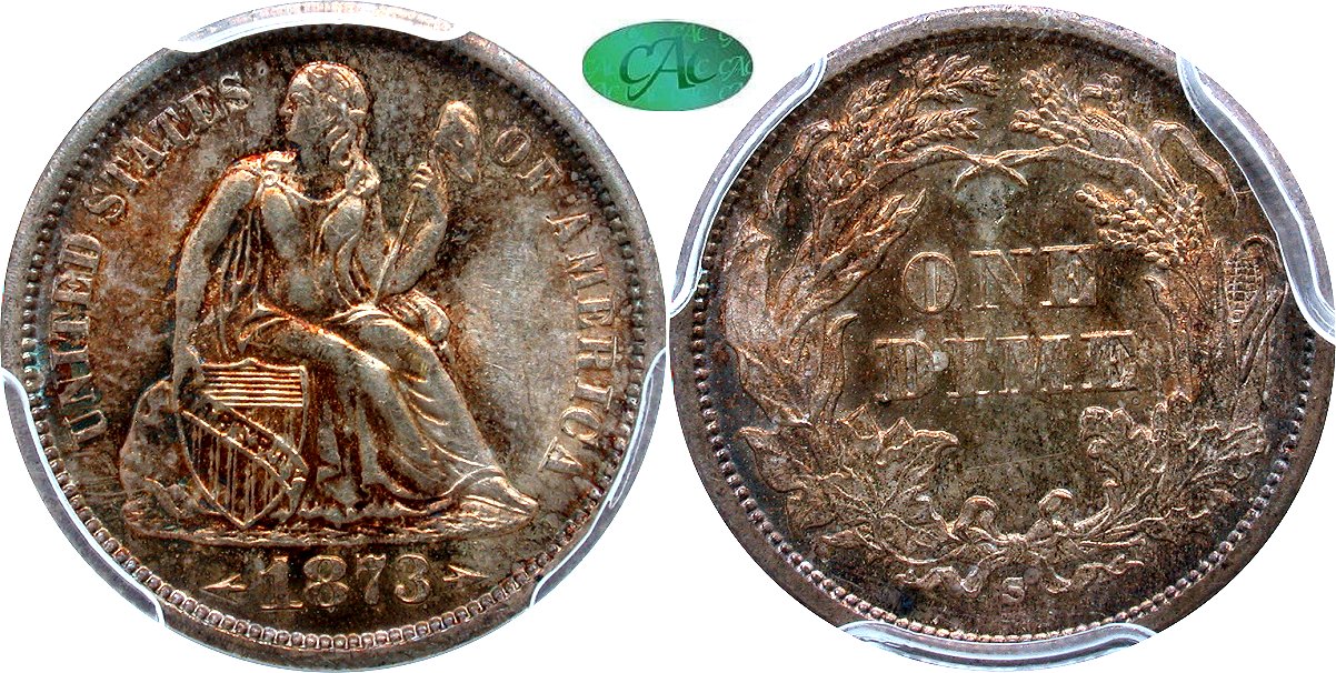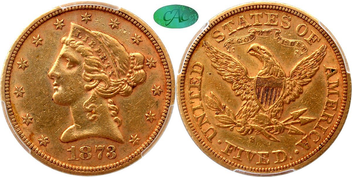 New November 26! Rare San Francisco Date, Choice Original, Tenafly Collection. 2025 Black Friday Sale Offering - A handsomely original piece, rich golden-gray and rose-apricot colors flow over smooth and lustrous AU surfaces. The mintage of 31,000 coins reported for the 1873-S is on par with those of other San Francisco Mint fives from the late 1860s and early 1870s and, like those other issues, heavy commercial use on the West Coast claimed most of the coins. This issue is scarce even in well worn condition, while in the popular collector grades of EF and AU only a few small handfuls remain. With only two Mint State examples known. The CAC census is currently 24 in all grades with six finer. The price guide suggests $3900 as fair market value, a figure that appears to be conservative when considering a mintage of just 31,000 pieces. A Tenafly lot that offers a compelling combination of rarity, originality, and aesthetic appeal. Housed in PCGS Gen 6.0 (2015-2020) holder with CAC approval. PCGS #8332.