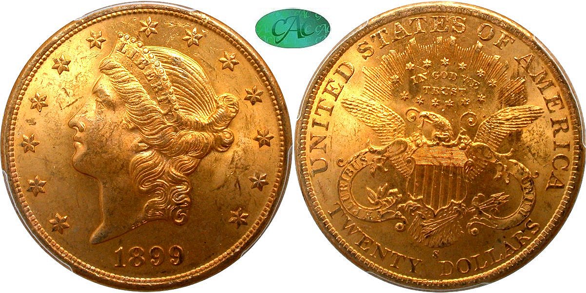 Attractive Honey-Gold, Partially Mirrored Radiance, Swirling Cartwheels, CAC Approved. With all the current attention on $20 U.S. gold due to a sharp increase is gold spot pricing to $3400, GFRC is thrilled to be offering a Near-Gem 1899 San Francisco struck Liberty with lightly mirrored fields and the corresponding reflective radiance. Both sides are equally mirrored as this lot was probably struck with freshly polished dies. Coloration is a deep honey gold. Bright light inspection was thoroughly pleasing as the view is undisturbed as the fields are surprising limited to just a touch of chatter. Liberty cheek is free of an obviously distractions. A conservatively graded example that is certain to please the collector. CAC has approved 186 is all grades, a low number for a date with a mintage of 2,010,300. The CAC guide is $5,500 as reference. Housed in PCGS Gen 5.0 (2015) Dupont hologram holder with CAC approval.