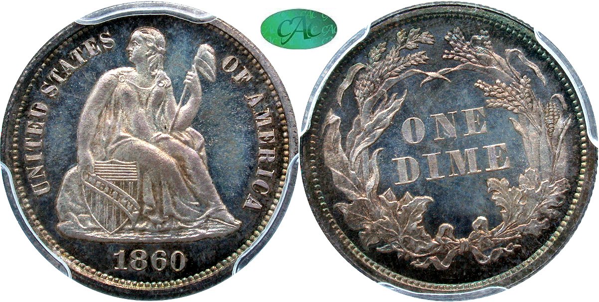 Gem $2960 New November 26! Superb Gem Type 1 Obverse Presentation, Brilliant Reflective Mirrors, Tenafly Collection. 2025 Black Friday Sale Offering - What a pleasure to be again offering this magnificent 1860 proof strike that originated from the Washington State Collection. 1860 brought 1,000 proof strike with the newly engraved and hubbed Type 1 obverse design per Longacre-Paquet. The design proved to be unpopular due to rapid wear of the high points and a flat overall appearance. When examining this piece, one of the finer extant, the intricate device details become apparent. I promptly noted that Liberty47s legs and breasts are quite elevated as compared to the low relief head details. Fields are brilliant reflective and surround frosted motifs. The Cameo eye appeal is thoroughly pleasing. If attempting to build a Liberty Seated dime proof set collection (1856-1891), this example will set the bar for premium quality and warrants a strong bid. CAC has approved 6 at the PR65 grade with eight finer. Housed in PCGS Gen 6.0 (2015-2020) holder with CAC approval. PCGS #84753.