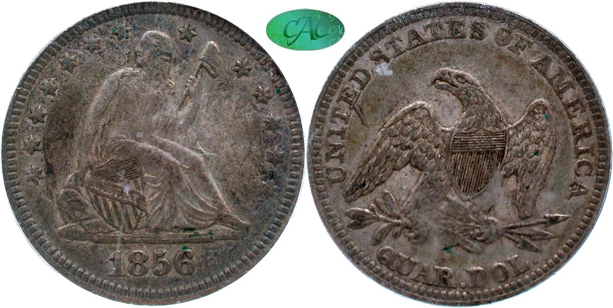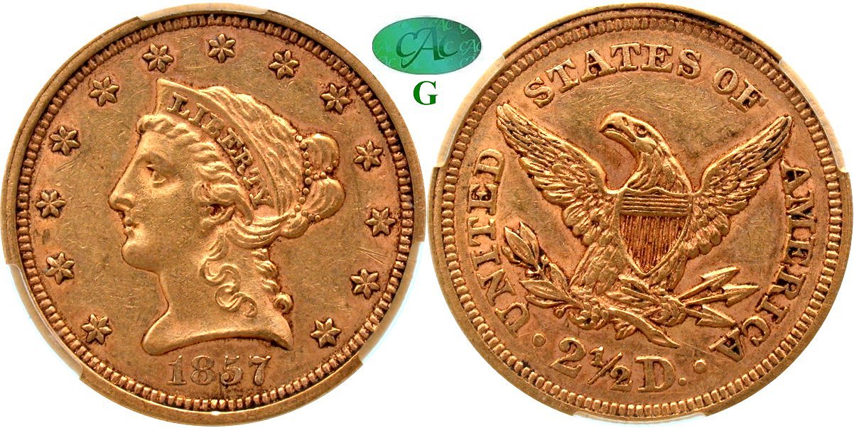Choice $850 Challenging "Common Date", Choice Original, Honey-Green Gold, Fresh CACG Grading. 1857 Philadelphia struck $2.5 gold amounted to 214,130 pieces resulting in numismatic experts viewing the date as "common". However, when fully choice, this date is challenging given that CAC has stickered only 41 in all grades while CACG has holdered two examples, one of which is being offered here. The premium nature is unquestionable with well preserved surfaces that are every so lightly worn. Coloration is a traditional honey green-gold. The CAC price guide is $925 as reference. Perfect as a pre-Civil War era type piece and much more difficult that the 1852, 1853, and 1854 Philadelphia issues and even the 1854-O . Housed in new CAC Grading holder and graded consistent with CAC approval standards.