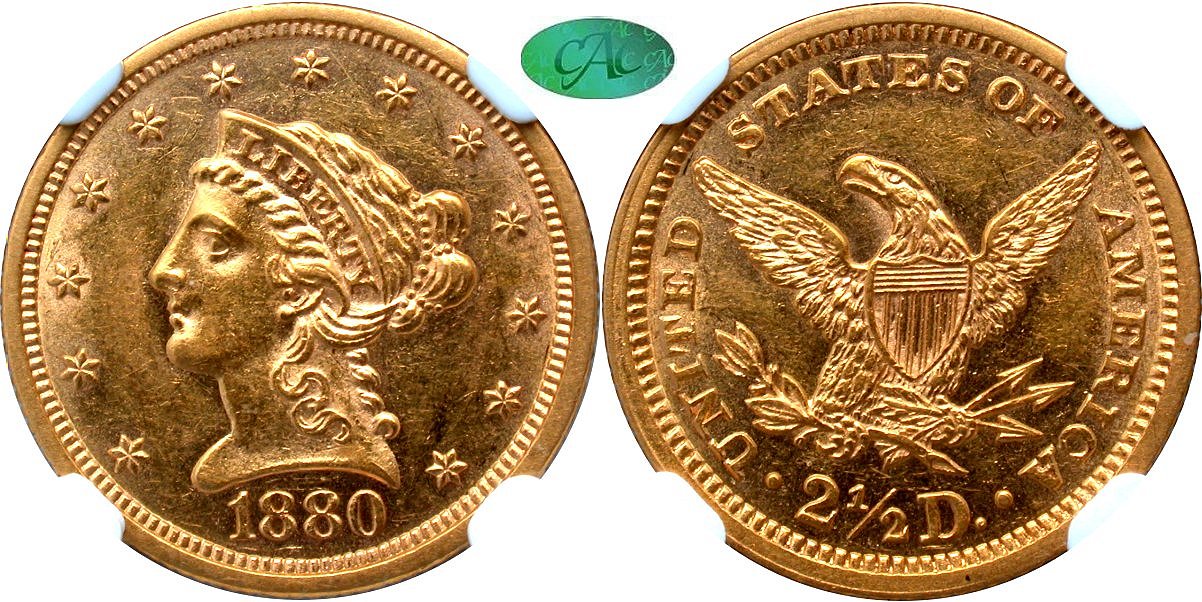 Gem $2115 New November 29! Gem Original Offering, Yellow Gold, Partially Mirrored Fields, CAC approved. 2025 Black Friday Sale Offering - The 1880 $2.5 gold issue is yet another lower mintage later date that continues to be underrated in the current marketplace. With a mintage of 2,960, this date is scarce in all grades. I was compelled to reward this exceptional example with a GFRC-Gem quality tating. Maybe I am enchanted by the mirrored fields that exhibit sharp reflectance under a bright light. Also compelling is the complete strike and unabraded surfaces with light rub consistent with the certified grade. Coloration falls into the honey yellow-gold realm. The CAC census currently stands at 25 stickered with a CDN price guide number being quoted as $2,250. There is a 50% pricing premium at MS62. Housed in NGC 25 (2008) holder with CAC approval.