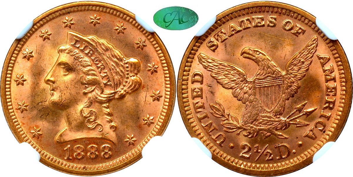 Gem $4830 New November 29! Near Finest Known, Richly Frosted Gem, CAC Approved. 2025 Black Friday Sale Offering - Mintage for the 1888 $2.5 issue increased to 16,001 as compared to the limited five digit production of prior years. Survivors in the lower Mint State grades are readily available with the date become very scarce in full gem. GFRC is pleased to be offering a CAC approved specimen at the lofty MS65 grade with a single example finer. The CAC price guide lists $5,600 as fair market value for reference. This lot is a "luster bomb" with rich honey-gold mint bloom on both sides. Under a bright light, the frosted radiance and cartwheels are thoroughly pleasing. The peripheral strike is hammered with raised stars and elevated reverse legend though the eagle47s left leg feathers are weakly defined. Worthy of careful consideration. Housed in newer NGC holder with edge view insert and CAC approval.