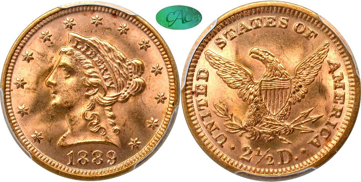 Gem $2392 Glowing Frosted Luster, Pristine Surfaces, GFRC-Gem Rated, Oregon Beaver Collection. Consignor Price Reduction - The 1889 Philadelphia quarter eagle issue sports a low mintage of 17,600 though sufficient quantities were saved during that period. A readily available date through MS64 with a dramatic population roll off starting in MS64+ in the PCGS population database. The CAC situation is similar with a census of 46 in all grades with only eight approved in full gem, with a pricing premium escalating over 3x. This new Oregon Beaver is a captivating offering that is most welcomed on the GFRC price list. Coloration is a uniform honey yellow-gold with glowing frosted luster during inspection. Pristine surfaces are noted with a 10x while the strike is weak at the eagle47s left leg, a common issue per the PCGS price guide plate coins. Housed in PCGS Gen 6.0 (2015-2020) holder with CAC approval.