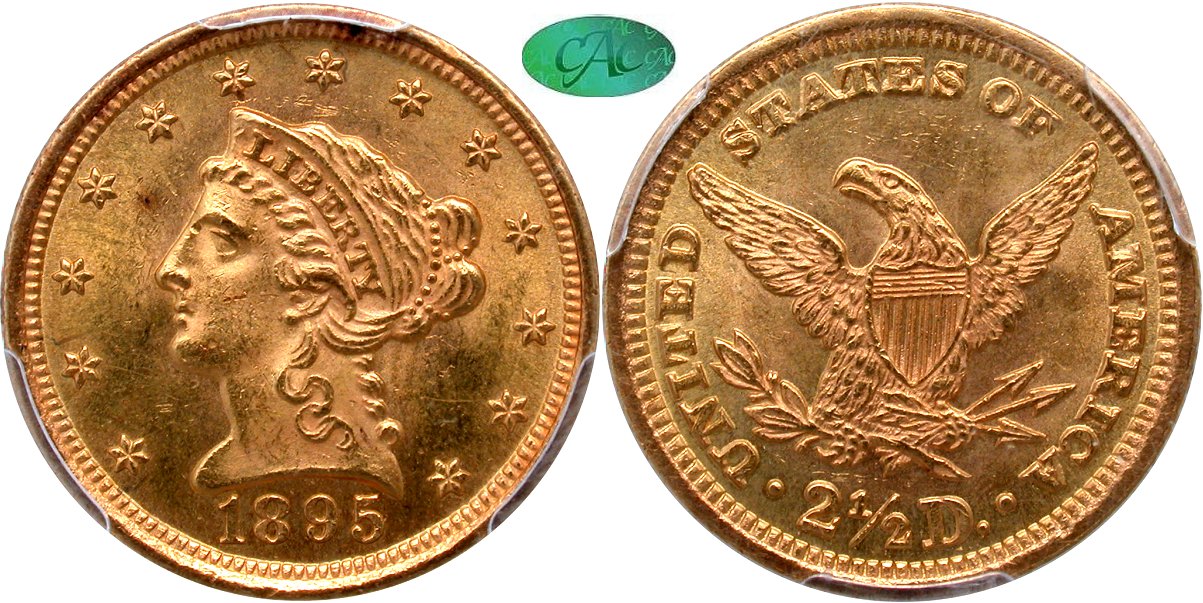Choice $2530 Eye Appeal of Higher Grade, Near-Gem Original, Oregon Beaver Collection.. Consignor Price Reduction - Every coin that crosses the GFRC desk has its special characteristics. In the case of this near-gem 1895 $2.5 quarter eagle, brilliant luster and eye appeal are that of a higher grade. Obverse fields are lightly mirrored and offer reflective radiance. Reverse fields are frosted with corresponding bright light appearance. Overall luster was so intense that the standard contrast application, during GFRC image processing, was dampened to accurate capture visual effects. The assigned MS64 grade is a function of faint obverse chatter in the field and on the cheek. Frankly, the luster far outweighs any contact marks. Limited mintage of 6,000. Housed in PCGS Gen 6.0 (2015-2020) holder with CAC approval.