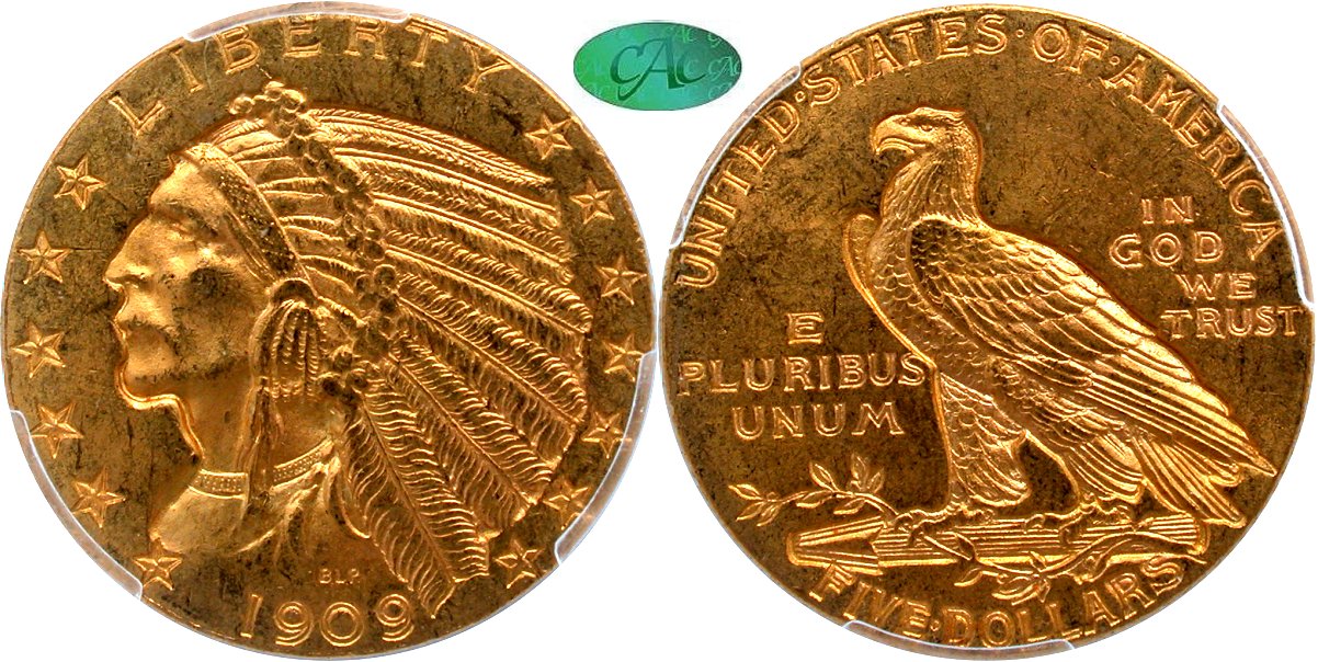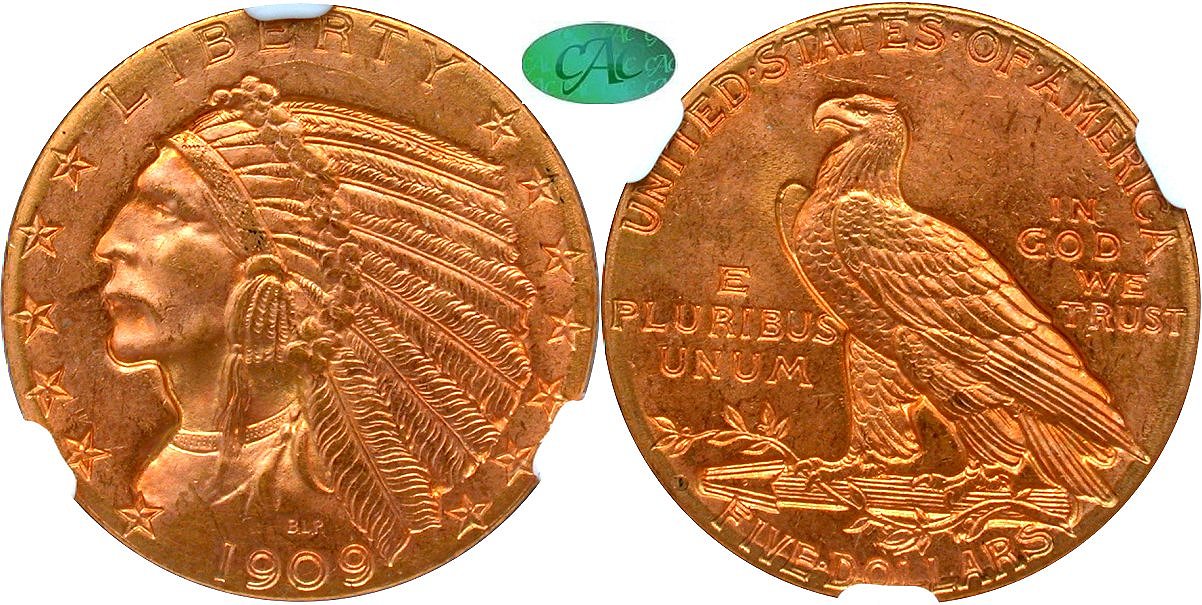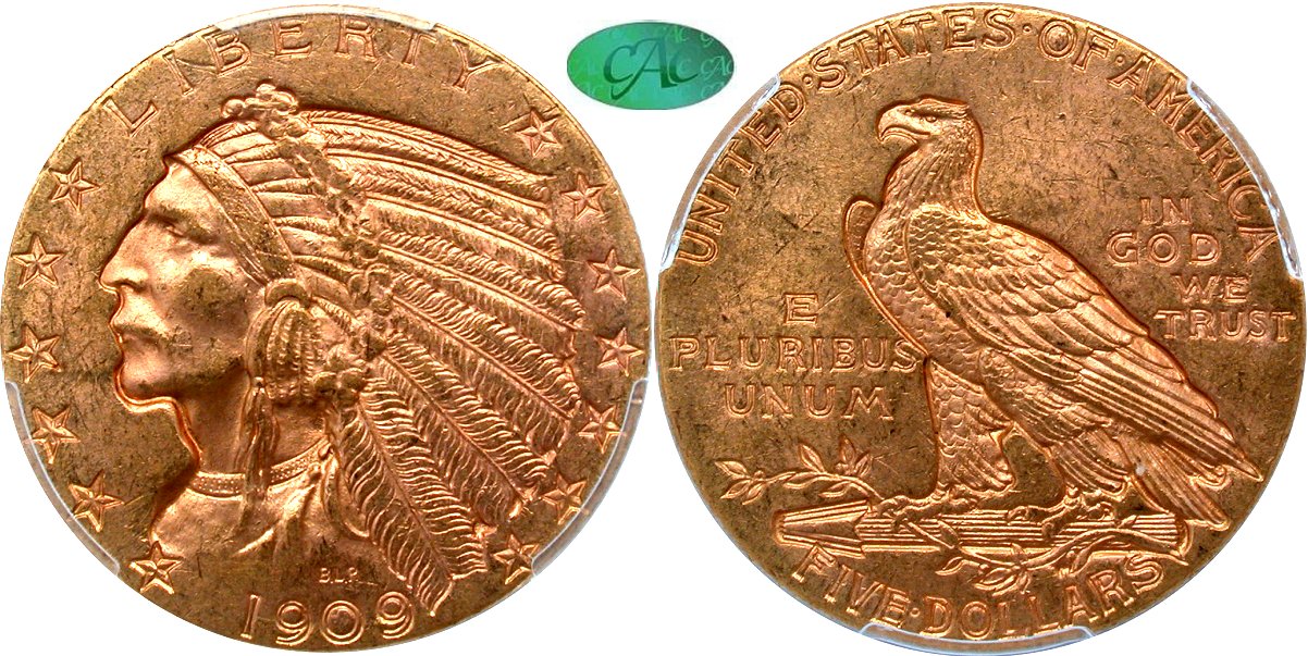 Choice $2800 Ideal Type Coin, Brilliant Satin Luster, Honey Green-Gold, Osprey Collection. Consignor Price Reduction. The 1909-D $5 Indian is common in Mint State, thus an ideal candidate for type or date set formation. When working with short series, locating those with superior eye appeal should be goal. This Pittsburgh ANA new purchase will fit the bill nicely with its satiny reflectance and uniform honey green-gold presentation. Overall strike is sharp with nicely detailed devices. Overall, a well balance example that would be perfect for type or other collecting goals. Yet another strong offering by the Osprey Collection. Housed in new large font NGC holder with CAC approval.