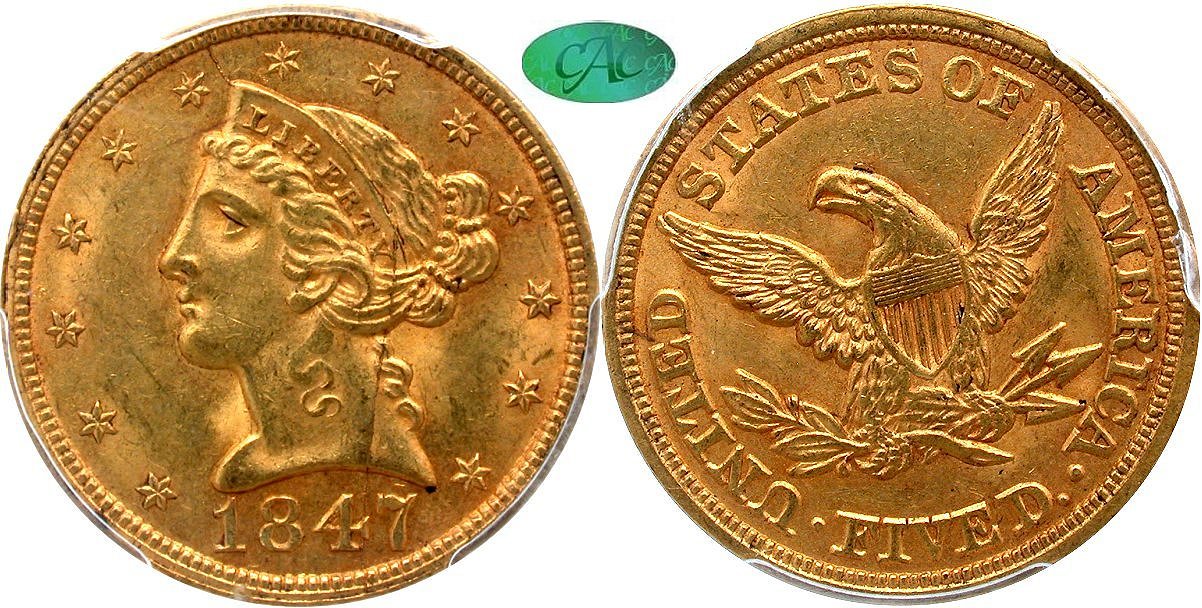 Choice $6225 New November 26! Very Scarce in AU, Choice Original, White Pine Collection.. 2025 Black Friday Sale Offering - Yellow gold surfaces lead to ample steely-frosted luster in the stars and legend, accompanied by minimal crust in the date and wings. Most of the star points are defined, if faintly so. The Charlotte Liberty $5 series includes 22 pieces, issued between 1839 and 1861, and there are no “impossible” coins in the set – an interesting challenge for those taken to dated gold. CAC has approved 65 coins in all grades with four examples in AU53 and 15 pieces finer. The CAC price guide value in AU53 is $6,750. Housed in PCGS Gen 6.1 (2020-2025) holder with CAC approval.