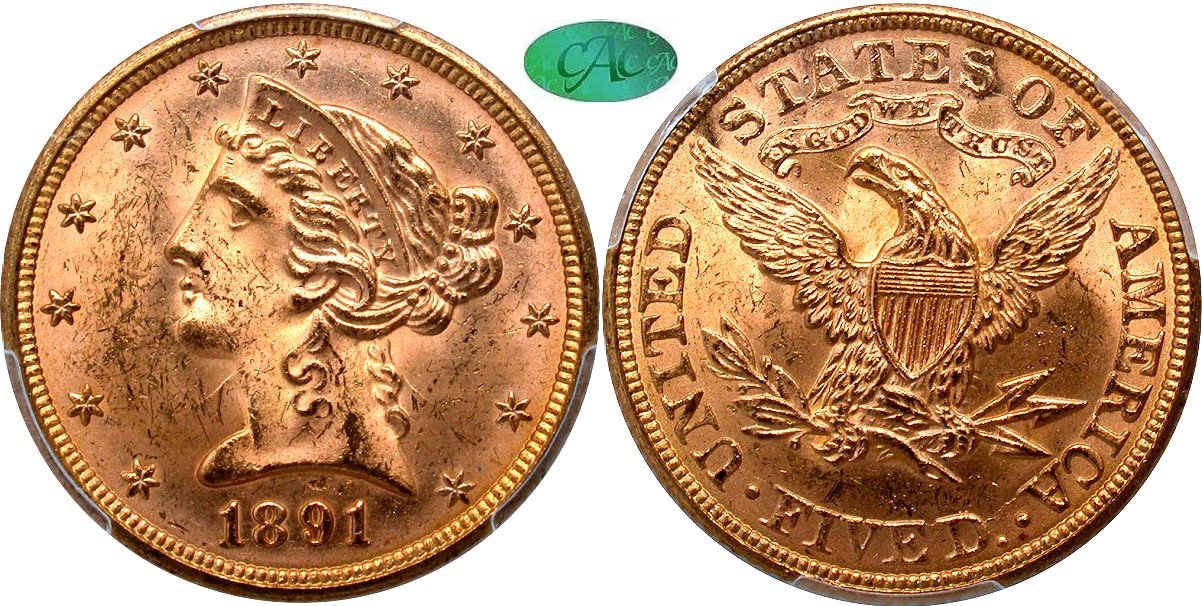Choice $3750 Rare Uncirculated, Superb Rose-Gold Coloring, Completed Strike, Near-Gem. 1891 Philadelphia $5 gold strikes were limited to 61,360 pieces in an era of massive silver coinage output. Most survivors are found with abrasions and/or light wear. At the MS64 level, this grade becomes rare and even more so with CAC approval. PCGS has not certified a single gem specimen, therefore MS64 and MS64+ graded examples are as good as it gets. GFRC is pleased to be offering one of the MS64 certified survivors that also has CAC approval. An infrequently seen rose-gold coloring is consistent on both sides. Bright light inspection is a joy given the brilliant frosted luster that explodes off the surfaces. Strike is 100% complete and rounds out the checklist for a designating this offering a near-gem. Housed in PCGS Gen 6.1 (2020-2021) holder. Previously sold by GFRC during June 2021 for $4350.