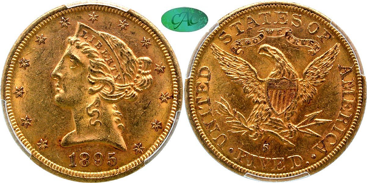 Choice $3750 Rare in Mint State, Few Finer CAC Approved, Sparkling Frosted Luster, Osprey Collection. Consignor Price Reduction. Another San Francisco $5 gold date that sports a reasonable mintage but is rare in choice Mint State. Even in the late 19th century, west coast coinage had few collectors to selectively "put pieces away" for the long term. As a result, the 1895-S date brings a substantial premium when CAC approved. All but 9 of the 45 approved are at the circulated level. The Osprey Collection is offering a choice example that exhibits pretty sparkling frosty luster and swirling cartwheels. Coloration is a light honey-gold. Scattered field chatter accounts for the certified grade. Only four are finer. Fairly priced for the rarity. Housed in PCGS Gen 6.1 (2020-2022) holder with CAC approval. The label captures the Fairmont Collection pedigree.
