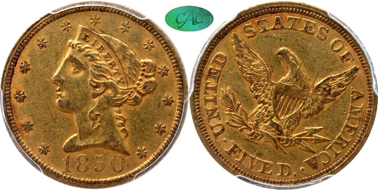 Choice $4095 New November 26! Rare and Underrated, Choice Original, Tenafly Collection. 2025 Black Friday Sale Offering - Opportunity knocks with this Tenafly release as the 1850 Philadelphia $5 issue remains rare and underrated. A first rate example with steely fields and ever so lightly encrusted green-gold coloration. All star centers are fully struck with the reverse arrow feather and horizontal shield lines being partial. This lot presents a fine balance between rarity and originality that should not go unnoticed, A CAC approved census of only 24 limits availability with a $3000 price guide value at the popular AU58 grade. most notable is a single piece finer. Housed in PCGS Gen 6.1 (2020-2025) holder with CAC approval. The insert notes the Fairmont Collection pedigree. PCGS #8243.