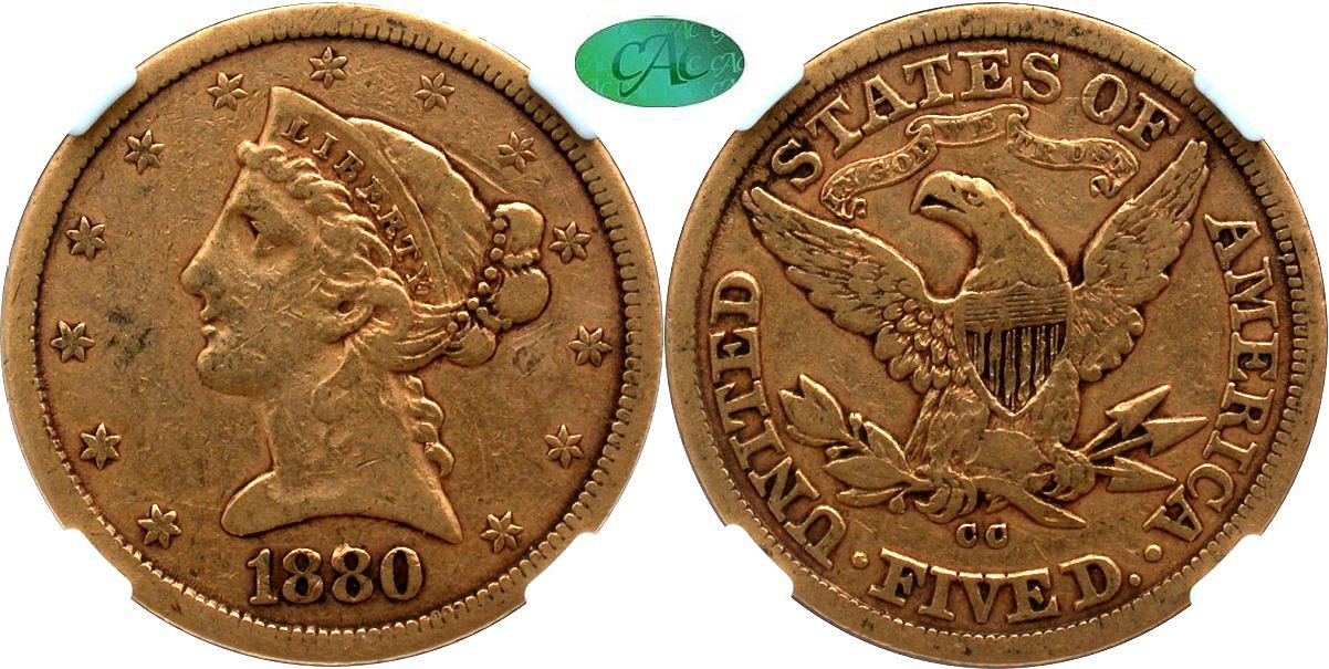 Choice $2675 Bettter $5 Carson City Date, Natural Copper-Gold, Choice Surfaces. The 1880-CC $5 gold piece is on the lower end of the survival scale when reviewing the CAC population report. A total of 65 examples have been approved with the bulk of the distribution between EF45 and AU58 at substantially higher premiums. If wishing to own a piece of early Carson City issued gold, this moderately worn example presents a compelling entry point. Surfaces are entirely original with the expected copper-gold patina. A few circulation marks attest to the fact that this lot did circulate in the early frontier period. Housed in new large font NGC holder with CAC approval. The CDN CAC guides stands at $2620 for reference.