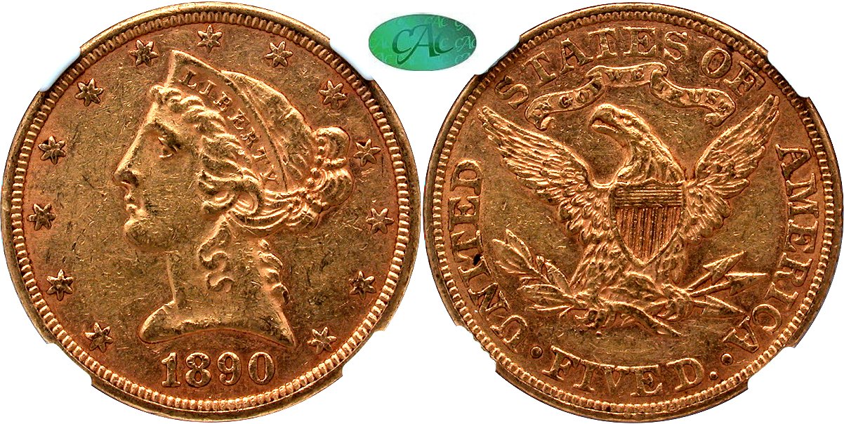 Choice $3275 New November 26! Tiny Mintage, Very Low CAC Population, Choice Original, Tenafly Collection. 2025 Black Friday Sale Offering - Given its tiny mintage of 4,240, this 1890 half eagle issue is a proverbial collector challenge in all grades. Luckily, the Tenafly Collection Liberty half eagle release includes this AU58 certified example with CAC approval. A premium specimen with moderately mirrored fields and a honey green-gold coloration with lighter shades appearing during an angled light review. The obverse fields exhibit light chatter that is typical seen at this offered grade and of no consequence to collecting pursuits of rare U.S. gold. The CAC census includes 19 in all grades with four finer. Sold into the Tenafly Collection during December 2021 with excellent illustrations for an aggressive bidding strategy. Housed in new large font NGC holder with CAC approval. PCGS #8375.