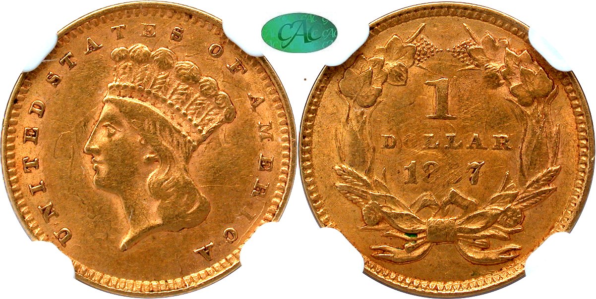 Choice $485 Choice Original, Honey-Gold Coloration, CAC Approval, Pikes Peak Collection. Consignor Price Reduction - Tough as a date, the 1857 is one of the common gold dollars and is ideal for a gold type set and the Type 3 Indian Princess slot. This Peaks Pike example was original source from GFRC given its well preserved surfaces layered with classic honey green-gold patination. The residual luster is quite impressive under a bright light. Housed in new large font NGC holder with CAC approval.
