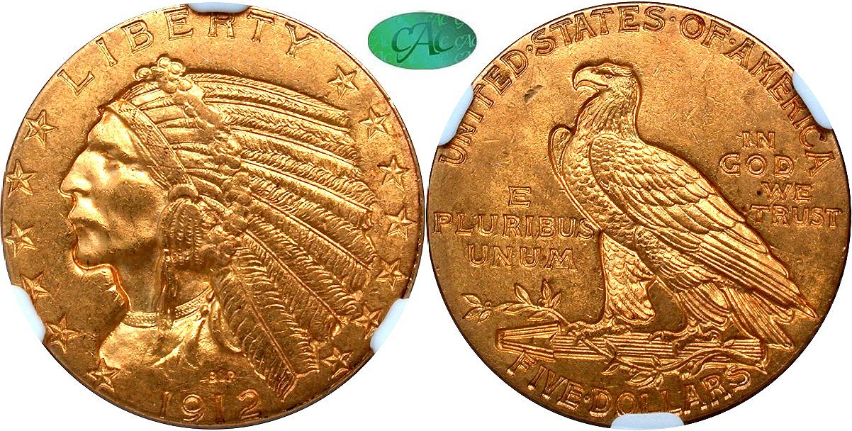 Choice $2550 Great Type Candidate, Steely-Frosted Luster, Honey-Gold, Well Preserved Surfaces. 1912 dated Indian $5 gold is known for its sharp luster and strong strikes. Yet another Summer Baltimore addition, this honey-gold colored example fits the bill. The obverse is pristine while there is one mark at the upper left reverse that is evident in the images. A premium example that is offered at a completive price to the CAC price guide. Housed in new large font NGC holder with CAC approval.