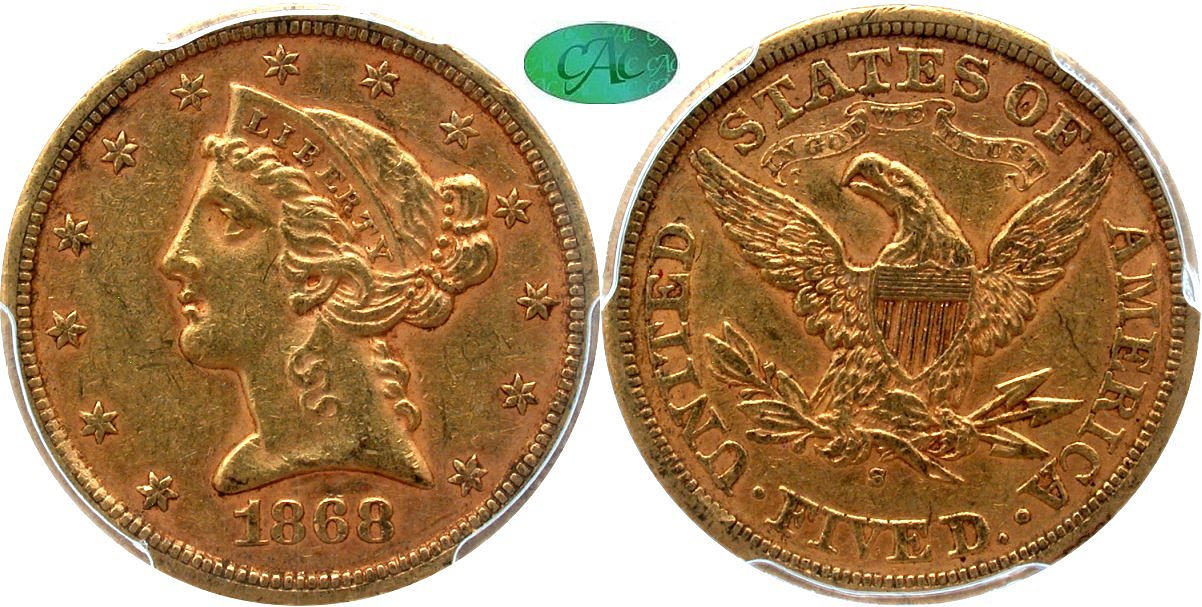 Choice $5525 New November 26! Rare Grade, Choice Original, White Pine Collection.. 2025 Black Friday Sale Offering - Pinkish-orange patina fills the rims and protected areas of this low-mintage San Francisco piece, contrasting with the steely gold fields. Survival of 19th century branch Mint coinage is often a matter of chance, and CAC reports only a single Mint State piece, MS62, which the CAC guide prices at a whopping $72,000. This piece remains well-advanced within the CAC condition census, bested by only four pieces in AU58 and the single MS coin. CAC has approved 19 coins total, and the CAC price guide value in AU55 is $6,000. While finest known status confers the all-important bragging rights, we would rather own, for the same money, a dozen coins like this AU55 example, as opposed to a single piece graded only a few points finer. Housed in a PCGS Gen 6.0 (2015-2020) holder with CAC approval.