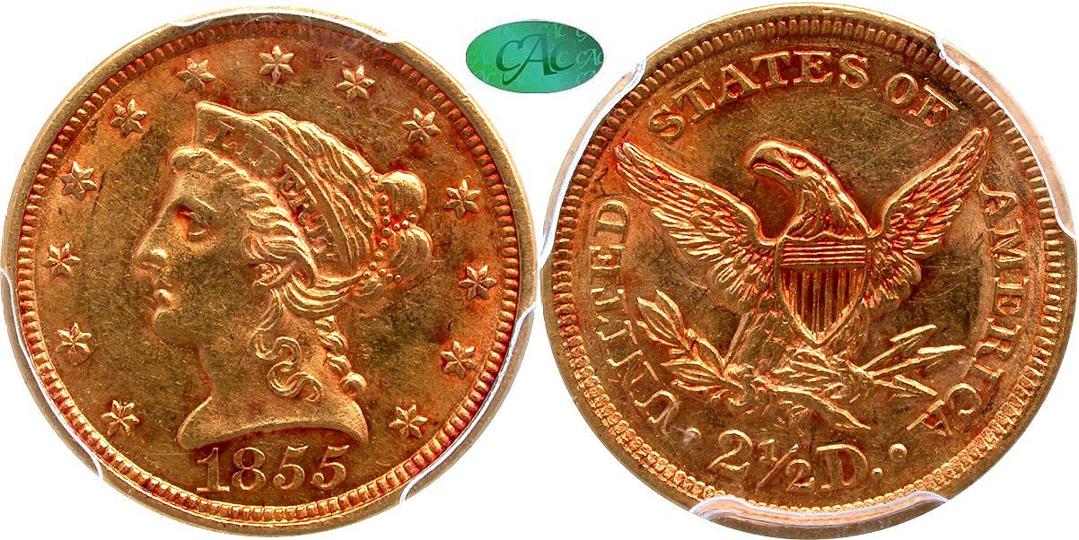 New November 29! Eye Appealing Orange Green-Gold Coloration, Light Wear. 2025 Black Friday Sale Offering - A wonderful 1855 $2.5 example with noteworthy visual presentation. The coloration is orange green-gold with the orange shades being concentrated towards the rims. The contrast with the lighter green center is quite notable on the obverse. Light wear was confirmed with a 10x. Images are accurate with respect to the overall eye appeal. This newly consigned offer returns for a second price list appearance. Please check the Sales Archive for the prior record. Housed in PCGS Gen 6.0 (2015-2020) holder with CAC approval.