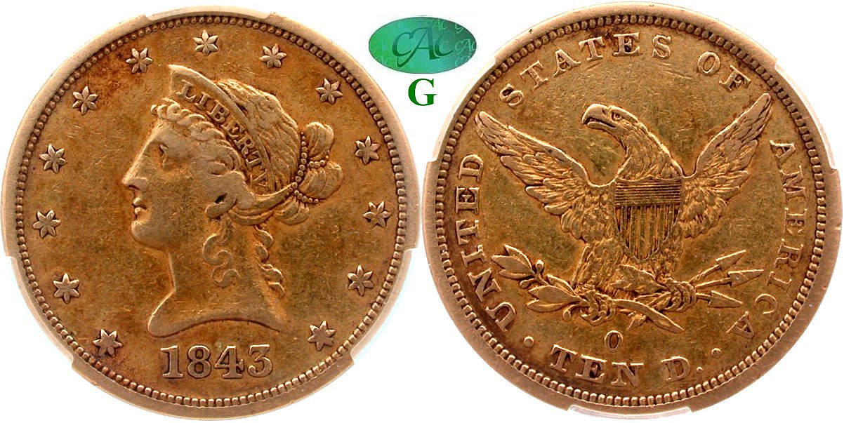 Gem $3250 New December 1! Superb Circulated Eye Appeal, Original Copper-Gold, Gem at Grade, Port Matilda Collection. Exceptional circulated eye appeal is readily apparent when first viewing this 1843 New Orleans $10 gold piece. I47m fussy about early circulated United States gold and expect to see a rich copper-gold skin as a testament to strict originality, This Port Matilda lot is essential perfect with continuous copper-gold patination and a hint of "dirt" on the TE of STATES that further validates the entirely unmolested surfaces. As usual, the grading is conservative while the surfaces are unabraded. CAC pricing for this date is $3000 at the offered grade. Furthermore this lot is the only CACG certified possibility through AU50. Housed in new CACG holder and graded to strict standards employed for CAC stickering approval.