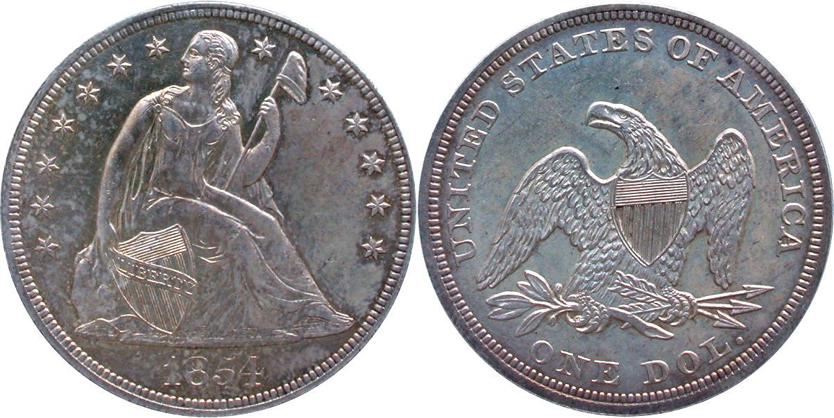 Original $18250 New December 15! Rare Date, Steely Luster and Premium Eye Appeal, Faint 10x Hairlines, New Jersey Collection. GFRC is pleased to be handling the New Jersey Collection47s 1854 Seated dollar as a rare opportunity to acquire a Mint State example with faint hairlines in the fields. The fields are naturally steely with mint frost surrounding the stars and legend. Light orange gold patination is deeper at the borders. PCGS choose to assign a Genuine opinion given the date47s rarity and financial risk with a larger buyback sum. In hand, this piece presents AU58/MS61 eye appeal with the expected bright light luster. Frankly, the 1854 and 1843 dollars are the strongest pieces in the New Jersey offerings in terms of old time eye appeal. Housed in PCGS Gen 4.4 (2005-2011) holder.