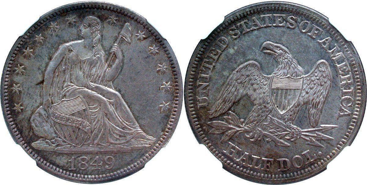 Choice $1725 Steely Reflective Fields, Light Golden-Gray Patina, Important Dick Osburn Pedigree, Sooner Collection. From the Sooner Collection arrives a choice 1849 WB-1 half with attractive light golden-gray toning over silver surfaces with a hint of blue in the fields. The strike is firm on Liberty47s head, the stars and the eagle47s claws, key visual inspection points. Under a bright light, the fields are quite steely with radiated reflective luster that is consistent on both sides. The in-hand rose-gray shades shift to golden-gray with darker hues at the borders. The certified grade is a function of light hairlines in the right obverse field seen with light and loupe. Dick Osburn Collection, August 2011 Chicago ANA Auction, lot 7033. Housed in newer NGC holder with edge view insert. The label documents the Dick Osburn Collection pedigree.