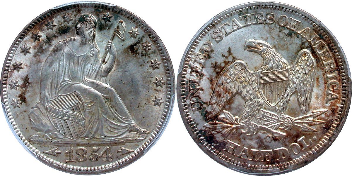 Gem $5250 Gorgeous Steely-Frosted Luster, Vibrant Cartwheels, Hammered Strike. 1854 New Orleans struck Seated halves are well know for exhibiting a double strike outline or "halo" like features at the stars and date punch. This newly consigned example is so representative of the date with its brilliant frosted luster and vibrant cartwheels. The strike is absolutely hammered with every minute device detail fully struck. The mottled gray toning is much lighted in hand than on GFRC images. A thoroughly satisfying example that deserve a home in an advanced collector. Housed in PCGS Gen 6.0 (2015-2020) holder.