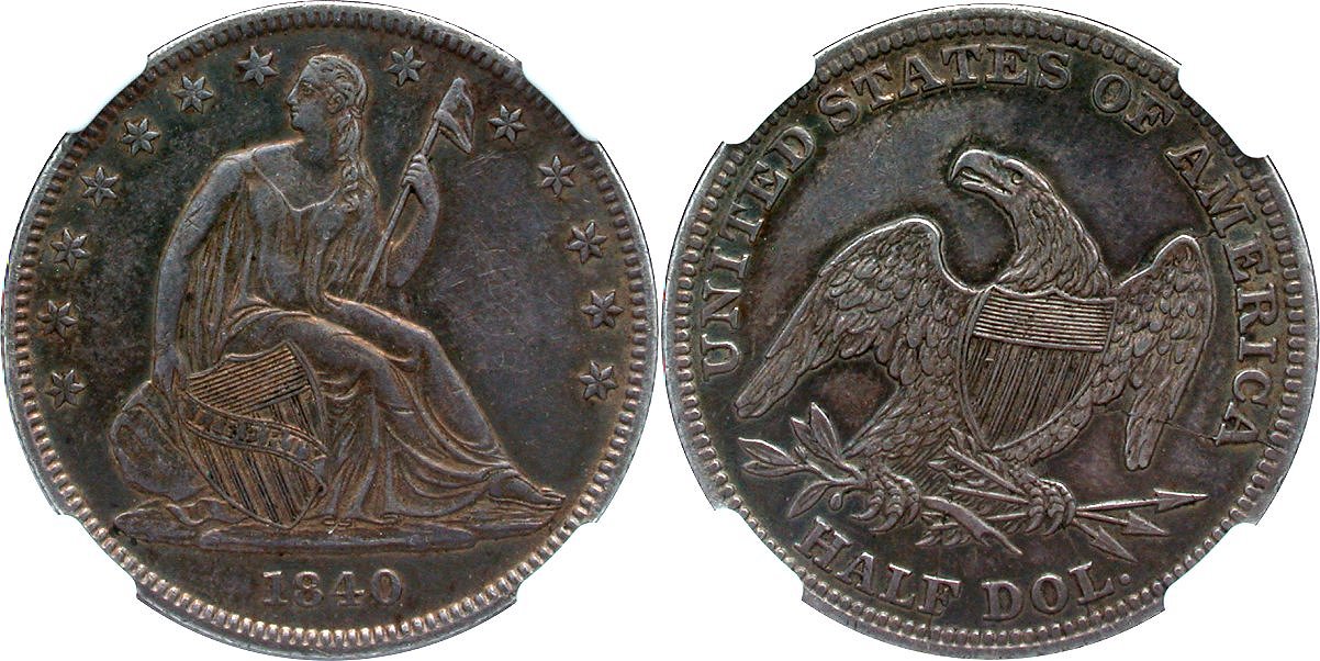 Original $4600 New Orleans Medium Letters Reverse, No Mintmark, Late Die State, Osprey Collection. Consignor Price Reduction. A special high grade offering of the 1840(O) design type for the advanced collector. The 1840(O) die pairing is necessary for both date/mintmark and type sets resulting in significant demand. The ongoing challenge is locating a choice original specimen as many are well worn or have been molested. GFRC is excited to be offering a mid grade AU example with golden gun metal gray patina and steely fields. The limited wear allows insight into the die rust throughout Liberty47s gown lines. Bright light inspection reveals reflective luster and some embedded gold. A 10x inspection revealed chatter in the right obverse field that precludes a GFRC-Choice quality rating. Freshly graded and housed in new large font NGC holder. The 1840-(O) MED LETTERS attribution is illustrated on the NGC label. This lot has been to CAC for review and did not sticker as I47m certain that someone will ask the question.