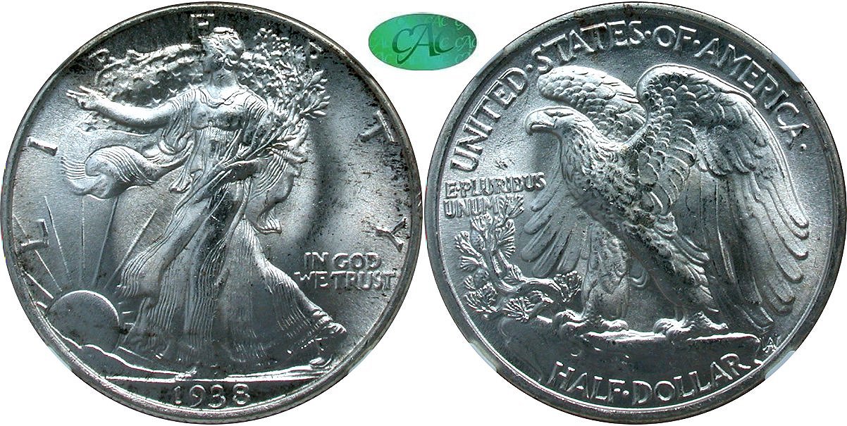 Gem $850 Gem Original, Cumberland County Collection.. This gorgeous 1938 half offers brilliant frosted luster and swirling cartwheels under a bright light. A fully struck specimen with deeply impress skirt lines, a high relief outreached hand and head that will please the most stringent strike fanatics. The pristine surfaces beg the question of why this "CCC" lot not certified to the next level. This is a compelling offering that warrants several bids to locate a suitable pricing level. CAC price guide is $685 at MS66 with an increase to $2250 in "7". Housed in new large font holder with CAC approval. PCGS #6604