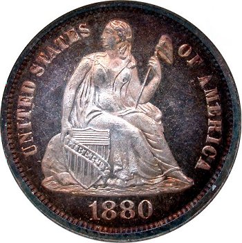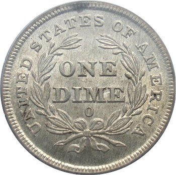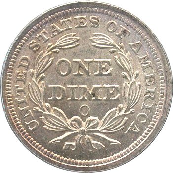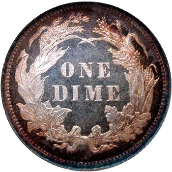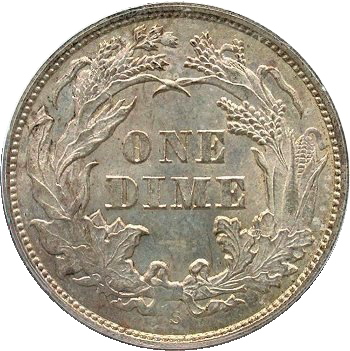 William Barber modified reverse design in 1876. New design has a single point left ribbon end while the E in ONE is farther away from the wreath. During 1876 through 1878, Type I and II reverse dies were used simultaneously except in 1877 at the San Francisco mint. No examples of 1877-S dimes with a Type I reverse have been seen.