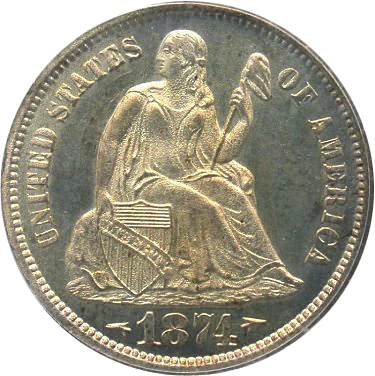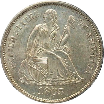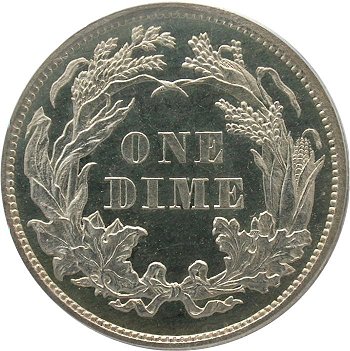 The obverse stars of the Hughes design were replaced by the statutory legend of UNITED STATES OF AMERICA by Longacre. The initial Type 1 obverse exhibited 5 vertical lines above LIBERTY in shield. "Newlin's Wreath of Cereal" reverse was composed of cotton, tobacco, sugar cane, corn, wheat and oak leaves enclosing the denomination of ONE DIME. This reverse is also designate as a Type I due to a future design modification in 1876. A Type I reverse is easily identification by a left ribbon end with two points. The E in ONE is close to the wreath.