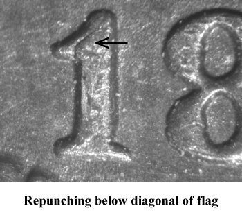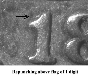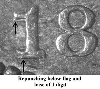 Repunching of the 1 digit is seen above the flag and above the left and right feet. Minor repunching is seen at the top of the upper loop of the 8 digit. | |||