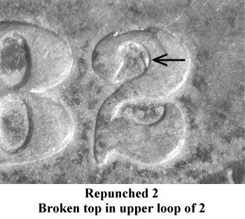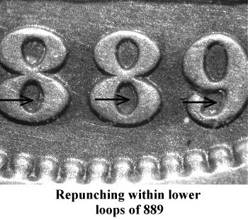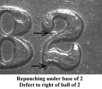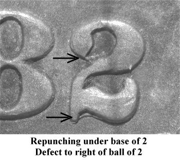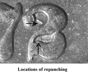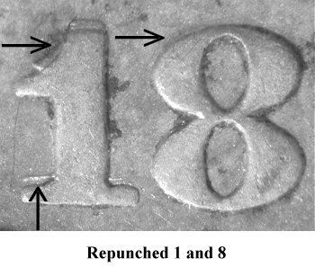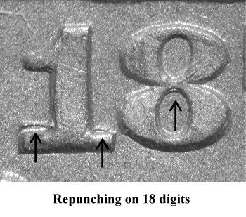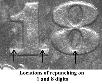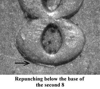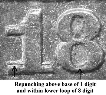 Repunching is most visible above the left and right feet of the 1 digit and within the bottom of the lower loop of the 8 digit. | |||