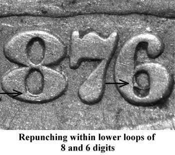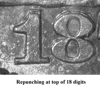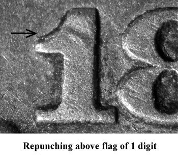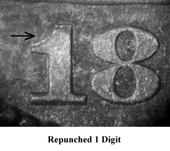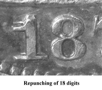 Repunching is visible above the left and right bases of the 1. Traces of repunching can be found within the lower loop of the 8 digit. | |||