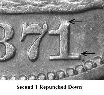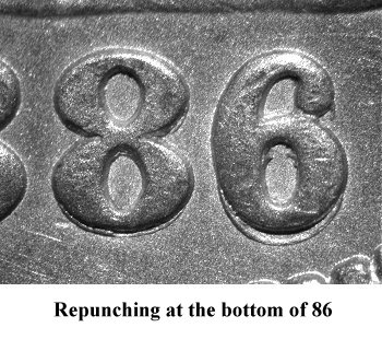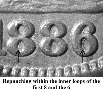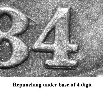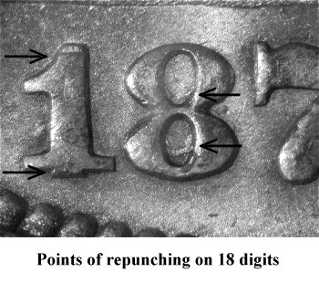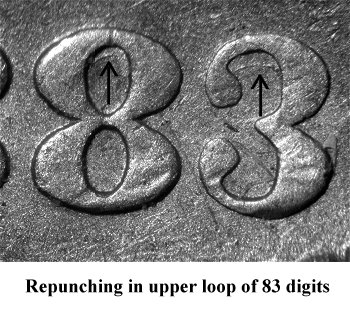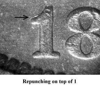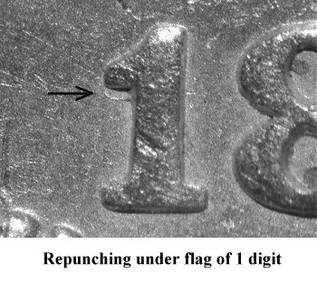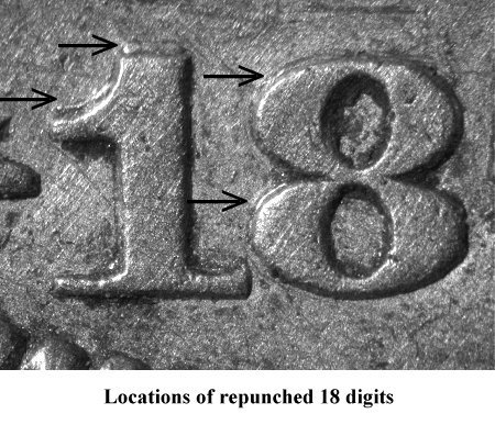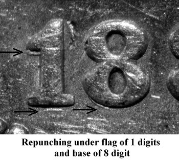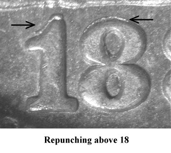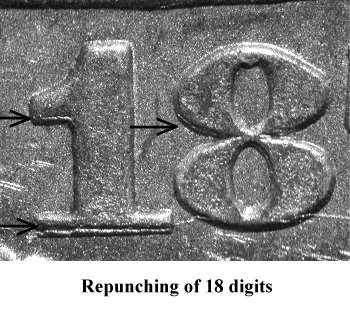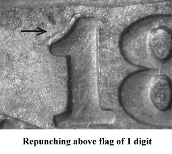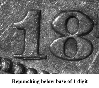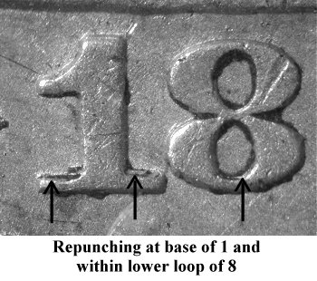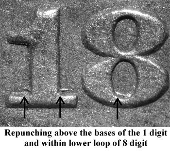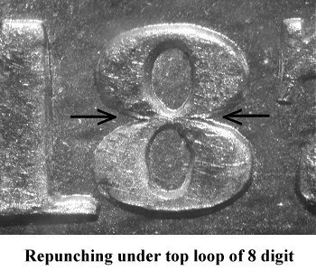 Business Strikes; The 1 digit shows repunching above the upright and below the base. On the 8 digit, repunching can be seen in the bottom of the upper and lower loops. | |||