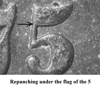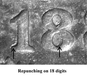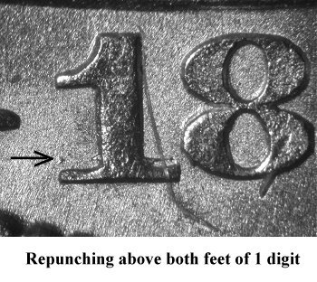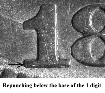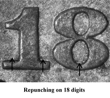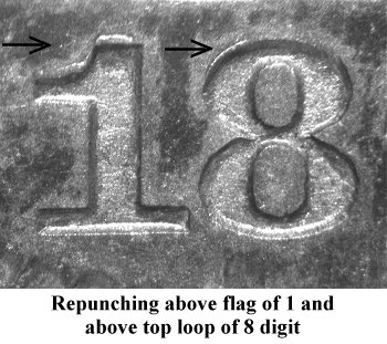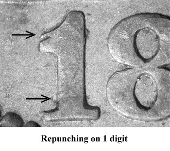 Repunching above the base of the 1 digit is easily seen and occasionally on the 8 digit. | |||
